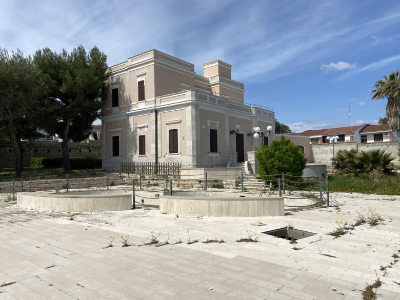 The volume of Villa Emy can be glimpsed at the far end of the garden, nestled among palm trees and tamarisks, just beyond the Trani stone wall that defines the panoramic promenade along Bisceglie’s seafront. Its character as a historic piece of architecture makes it a landmark – a point of interest that stands out for its aesthetic value and its role as a vessel of memory within a natural landscape. This setting, once agricultural, became urbanised and hybridised in the post-war years with the construction of indistinct, heterogeneous residential and tourist buildings.