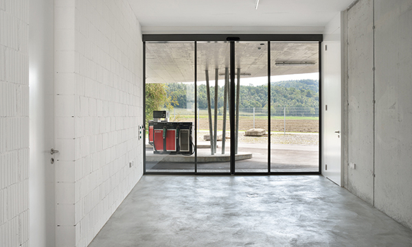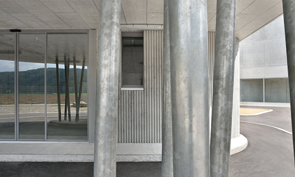 Das Gewerbehaus besteht aus gerilltem Ortbeton, das Palettenlager aus Fertigbetonelementen mit Noppenstruktur.