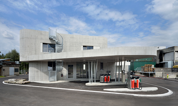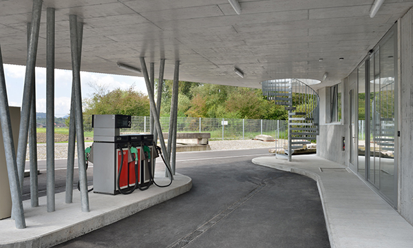 Das Gewerbehaus befindet sich am westlichen Rand der Anlage. Die Vorgabe, ein beheiztes Gebäude mit fiktiver Tankstelle und Tankstellenshop als Bestandteil der Übungsanlage zu entwerfen, führte zu seiner spezifischen Ausformulierung. Es steht mittig, von Strassen umgeben, auf der zugewiesenen Parzelle. Ein ausladendes Betondach thematisiert die Tankstelle und den Zugang zum fiktiven Shop. Neben dem Shop befinden sich eine Einstellgarage sowie Nasszellen.