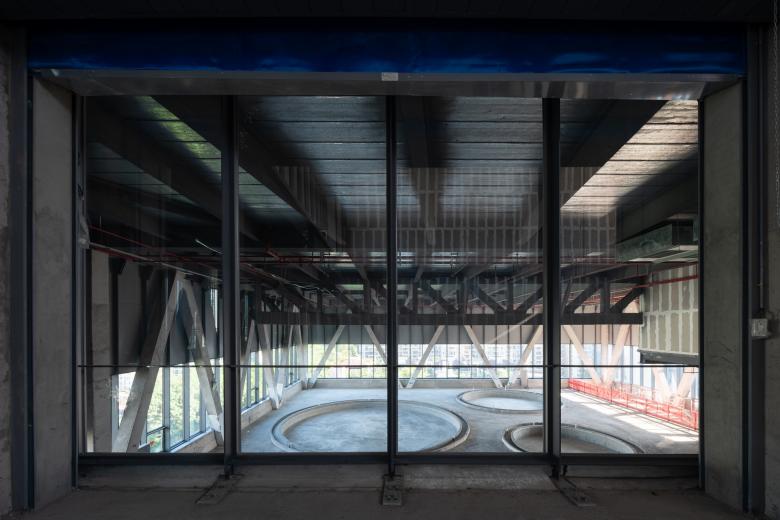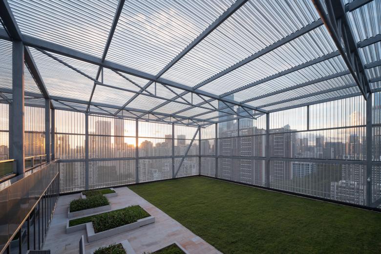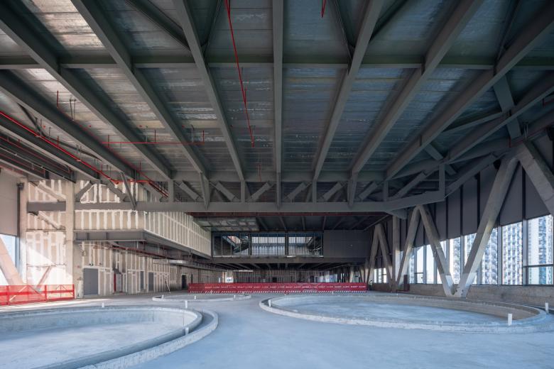 In terms of functional allocation, considerations such as the efficiency of space use, the rationality of structure and environmental impacts have been fully concerned. The library locates in the ground floor, which created the best accessibility and its regular column network as the support of the large-span space truss above ensures the rationality of the structure. The swimming pool is raised to the middle of the volume, and the semi-open platform layer right below the swimming pool serves as an outdoor waiting area. The pool not only has a panoramic view of the city but also becomes part of the city's landscape. The sport programs are placed at the highest point of the volume to minimize noise disturbance to the surrounding environment, and the sky sports garden below it can serve as a plaza for residents to warm up and exercise outdoors.