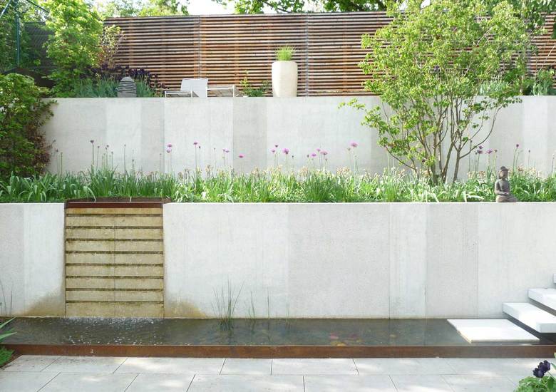 Der obere Gartenteil ist in zwei weitere Gartenterrassen gegliedert und über einseitig eingespannte Stufenplatten entlang der beiden ca. 1,5m hohen Betonstützmauern erschlossen. Auf dem obersten Niveau des Gartens ist ein weiterer Sitzplatz in exponierter Lage angeordnet, der auch am Abend die letzten Sonnenstrahlen erhält.