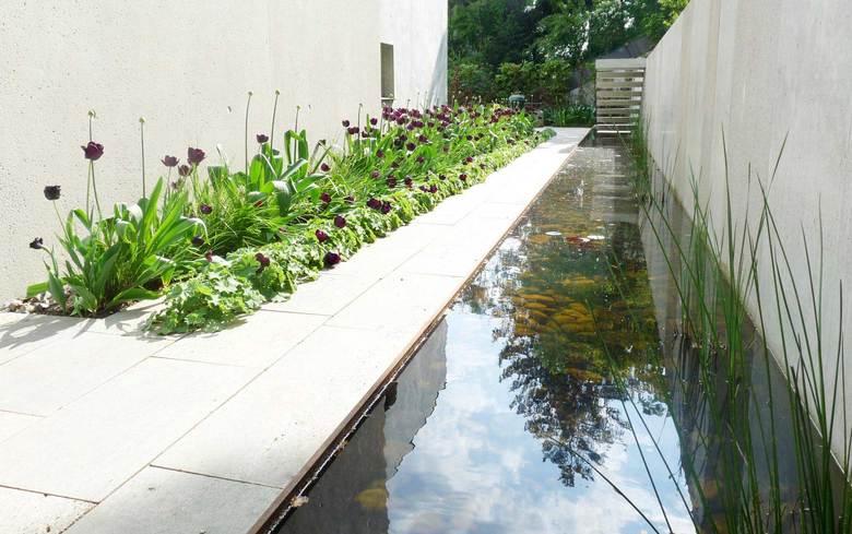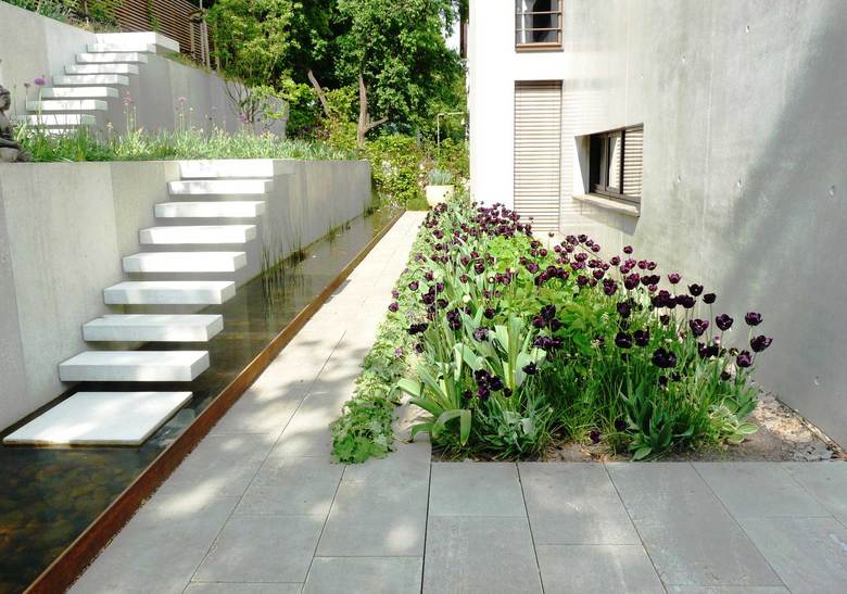 Der an einem steilen Hangrundstück im Stuttgarter Westen entstandene Garten verbindet sich konsequent mit der Architektur des neuen Wohnhauses. Die Gestaltung des Gartens bezieht sich auf die vorgefundene topografische Situation mit einem Höhenunterschied von 12 Metern von der unteren Zugangsebene bis zur oberen Grundstücksgrenze. Stützmauern aus Beton und Naturstein terrassieren das Gelände und entwickeln unterschiedliche Niveaus mit quer zum Hang liegenden Terrassen. Drei Gartenebenen und zwei Gartenterrassen spannen über die gesamte Grundstücksbreite und gliedern den Garten. Reduziert gestaltet Treppenläufe erschließen die unterschiedlichen Ebenen von Haus und Garten. Das Gartengeschoss mit zwei gliedernden Rasenflächen und dem Pool als Abschluss befindet sich auf der Erdgeschossebene des Wohnhauses und inszeniert den weiten Ausblick über die Stadt. Im oberen Gartenteil befindet sich das 23 m lange Wasserbecken mit zwei weiteren Gartenterrassen und einem über Steckstufen erschlossenen Sitzplatz auf dem obersten Gartenniveau.