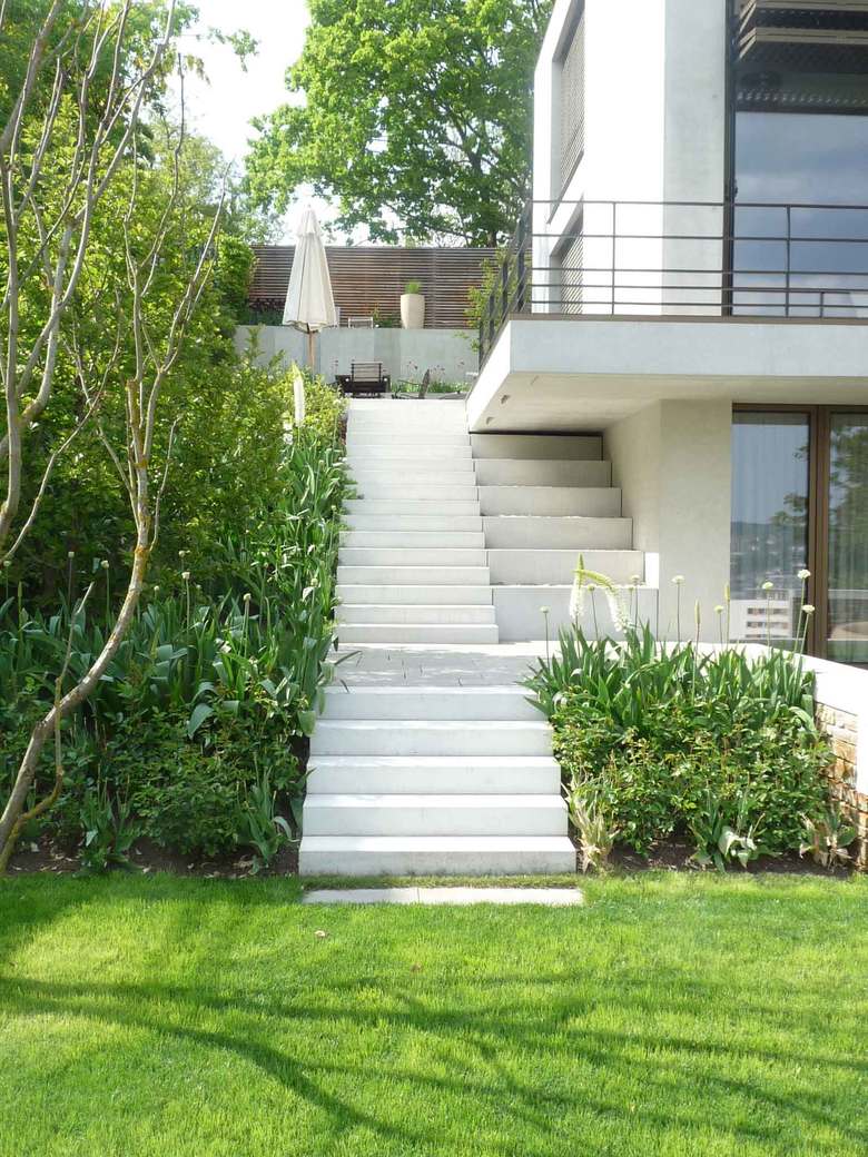 Die Erschließung erfolgt von unten. Eine ca. 3m hohe Stützmauer verbendet mit Gneis schließt das Grundstück zur Straße ab und formuliert das Erscheinungsbild für die Ankommenden. Die Zugangssituation zum Haus und Garten ist östlich neben der Garage angeordnet. Eine Treppe überwindet die ersten 2 m und verläuft parallel zur Stützwand. Vom Zwischenpodest aus wird die Höhe über einen langen einläufigen Treppenlauf bis zur Erdgeschoßebene des Gebäudes überwunden, die um etwa 8m über dem Straßenniveau liegt. Auf der Erdgeschossebene befindet sich die Hauptterrasse des Gartens. Ein dem Wohnbereich vorgelagerter Sitzplatz orientiert sich nach Südwesten und bietet reizvolle Aussicht auf den Stuttgarter Westen. Alle Belagsflächen im Garten sind mit Muschelkalkplatten belegt, die sich auch im Bodenbelag des Gebäudes fortsetzen.