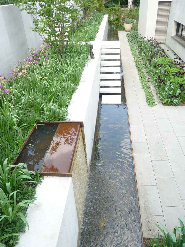 Im Nordwesten spannt ein über die gesamte Breite des Gartens verlaufendes ca. 23m langes Wasserbecken. Das Gartengeschoss wird von dieser Terrasse über eine weitere einläufige Treppe erschlossen. Eine dort angeordnete Rasenfläche ist in zwei Ebenen gestaffelt und mit einer Stützmauer um ca. 80cm nach unten terrassiert. Der sich auf der untersten Gartenebene befindliche Pool liegt um ca. 5 m über dem Straßenniveau, an der vorderen Kante der untersten Gartenterrasse. Vom Pool aus schweift der Blick über die Dachlandschaft der Stadt bis zu den gegenüberliegenden Hanglagen.