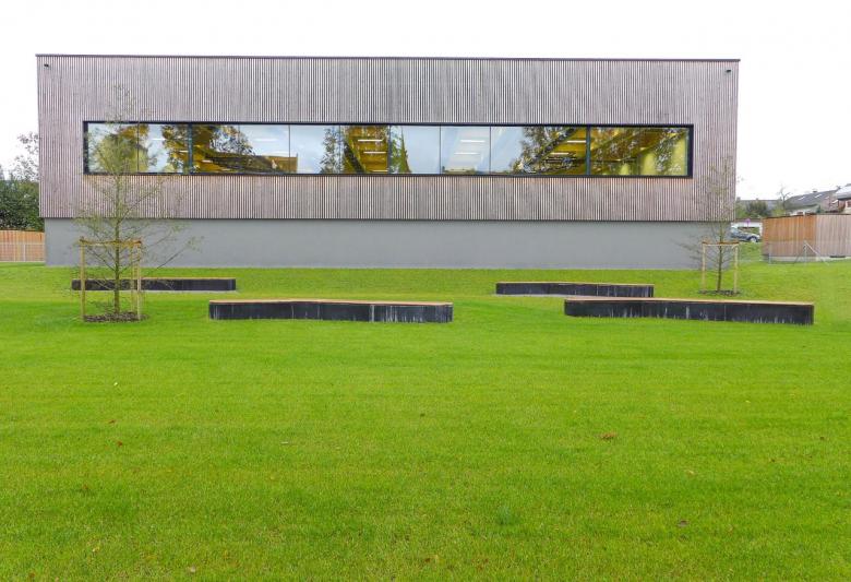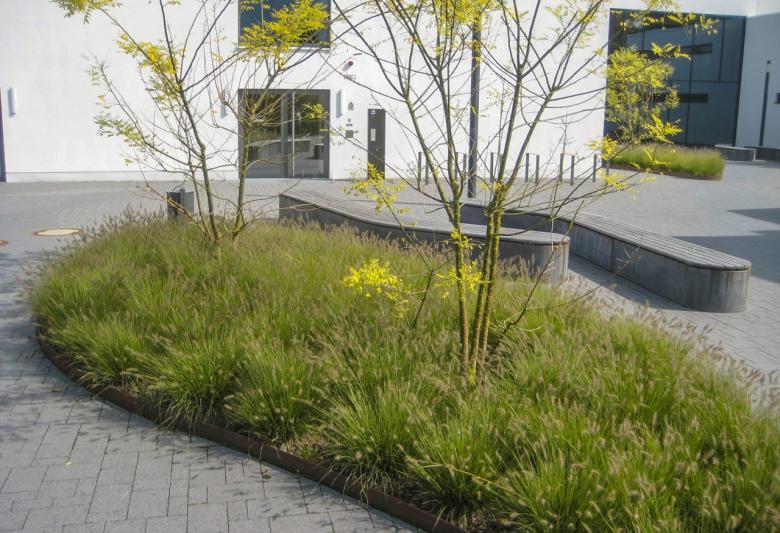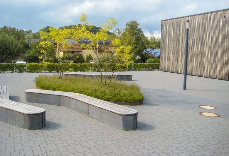 Im Zuge der Sanierung und dem Umbau der Schulgebäude erfolgte auch die Umstrukturierung der Freianlagen auf die heutigen Nutzungsansprüche eines Schulstandortes. Haupteingang und Neubau der Sporthalle werden über den neuen Eingangsplatz erschlossen. Die neue zentrale Eingangshalle öffnet sich mit der vollverglasten Front zum Platz und erschließt alle Schulbereiche.