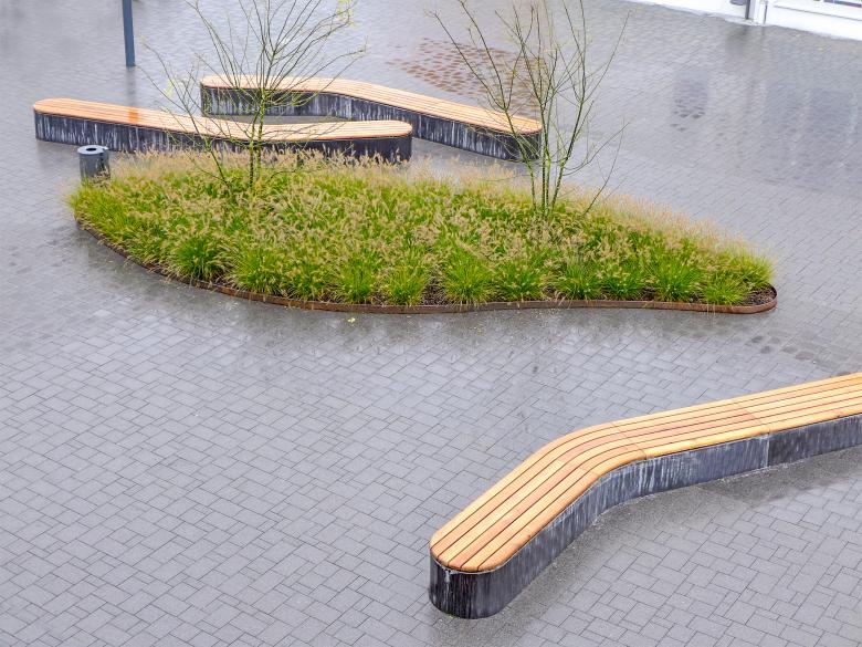 In Anlehnung an die direkte Lage der Schule am Inn, zieht sich ähnlich den Stromlinien eines Flusses, ein Muster aus weich geschwungenen Flächen über den Schulcampus hinweg. Das Motiv der stromlinienhaften Bewegungen und Flächen wird übersetzt in ein lebendiges Wechselspiel aus unterschiedlichen Belagsflächen mit darin eingebetteten geschwungenen Pflanzinseln. Die Sitzmöbel nehmen die Formensprache auf und sind als so genannte „Boomerang- Bänke“ gestaltet.