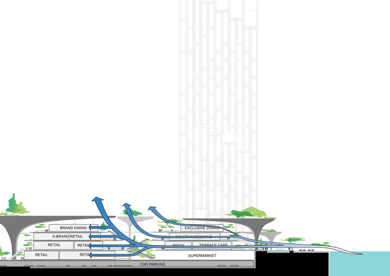 At high level, each of the tall towers is made up of 3 distinct vertical volumes that rise and slide past each other, creating a simple but elegant layered form topped by a series of cascading terraces. The undulating height of the 3 slabs breaks up not only the scale of the towers but also help in layering the skyline.