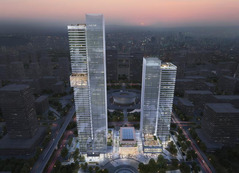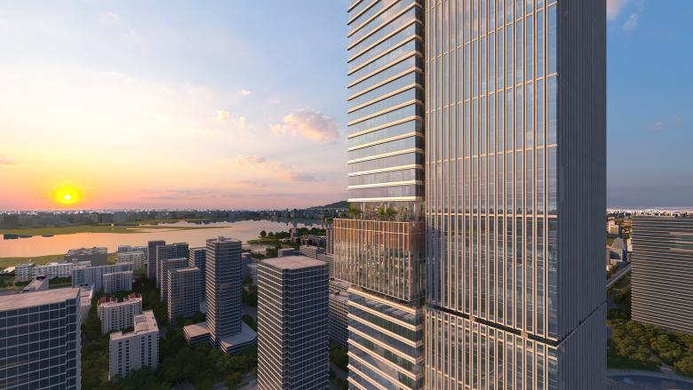The 178,888sqm development includes two towers, containing a 55 storey hotel and condominium hotel tower with a dramatic sky-lobby and a 41 storey office tower. A four storey retail pavilion is located between both towers in the middle of the site with an active F&B roof garden and a hotel amenity terrace that connect across the site. Ground level plazas and pedestrian streets activate both edges of the central retail pavilion and are lined with retail and restaurants.