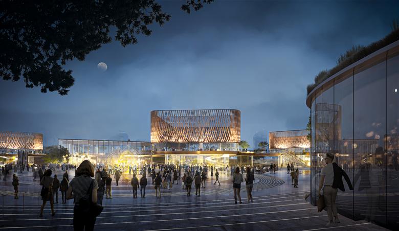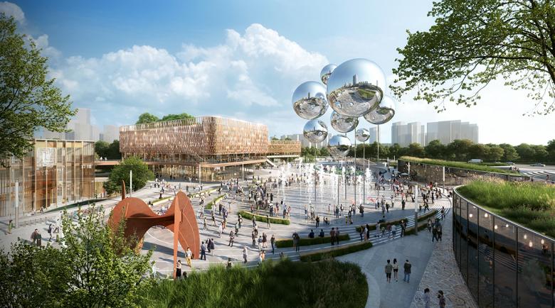 The clusters of pavilions and event spaces are structured around primary arrival and viewpoints which sit as the gateways into the park binding a substantial and varied public realm of entertainment spaces, lifestyle areas, and sports and event stages. This series of stages provide a prominent focal point for the community, as regards health, wellbeing and communal activity between the two environments, which all connect back to Joy City through both visually and physically.