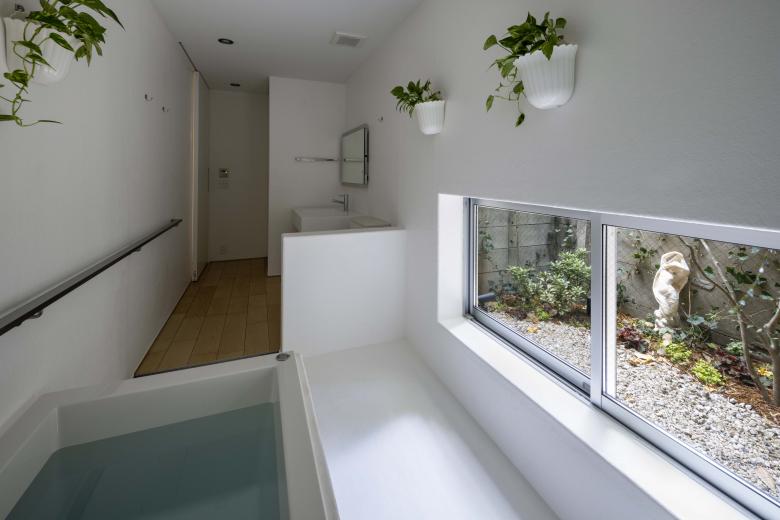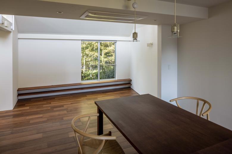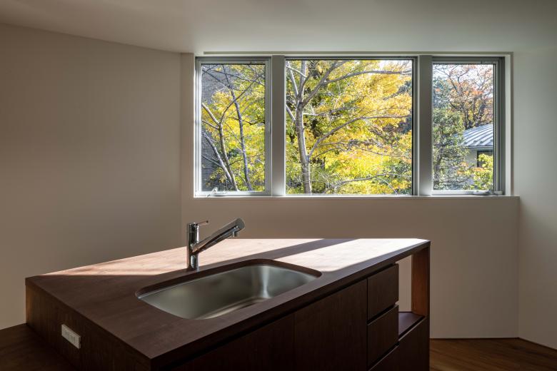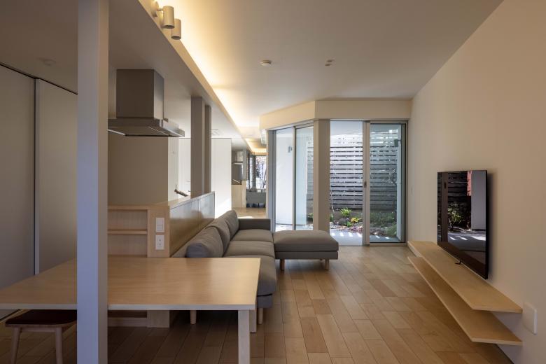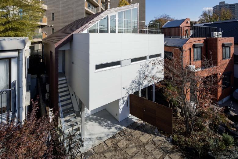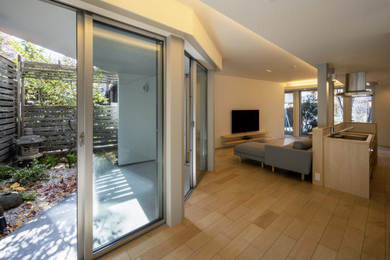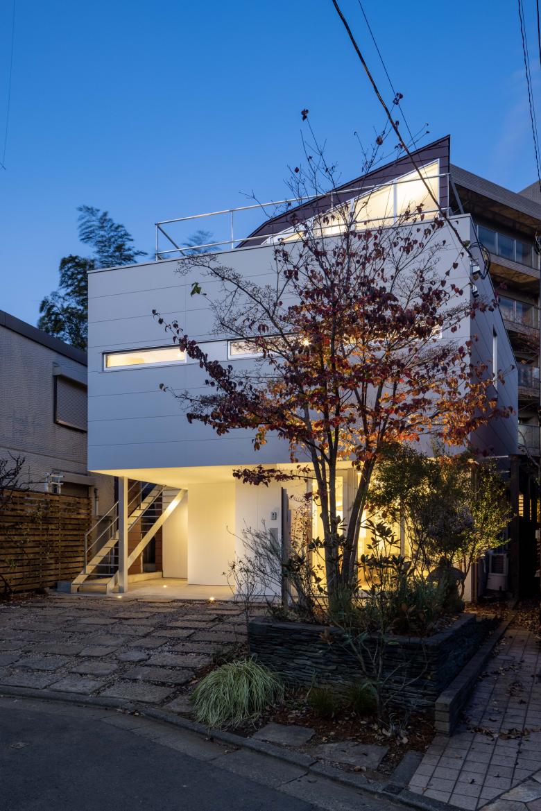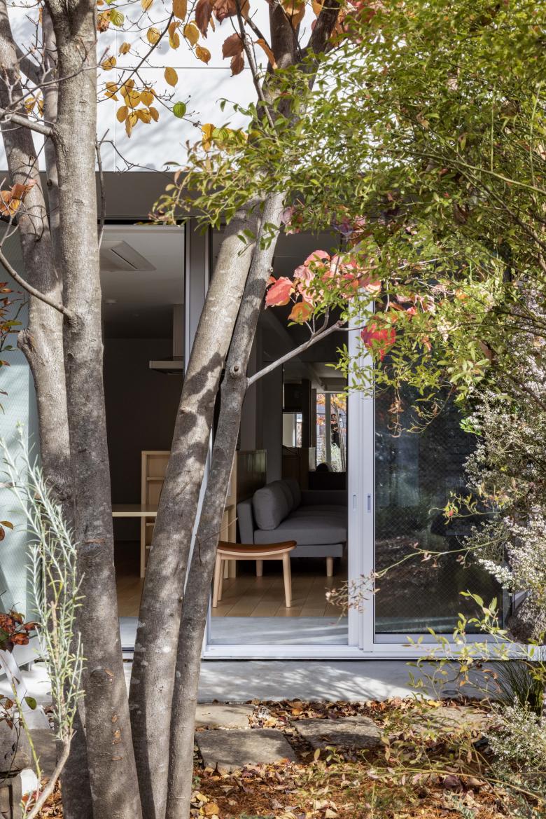外部に3つの庭と富士山を望むテラスを配し、内部には雁行する背後の高層住宅が生む大きな緑地を互いの視線を避けつつ借景。