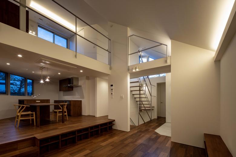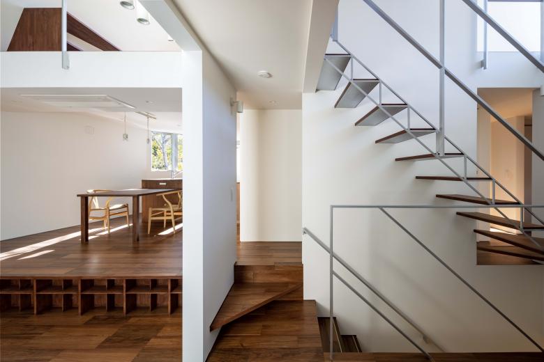 それぞれループする二世帯の動線同士を、納戸階段が繋ぐことも分けることもでき、将来の自由な使用法にも対応します。