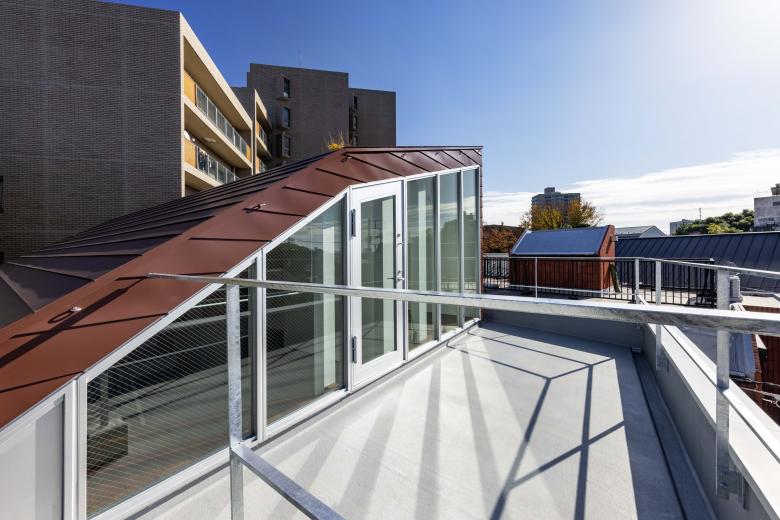 断面は、床はバリアフリーで天井高を変化させた親世帯と、その高低差を収納や開放感に活かした子世帯が、互いのリビングを入れ替え、厳しい斜線の中で建物全体の最大容積を確保しました。