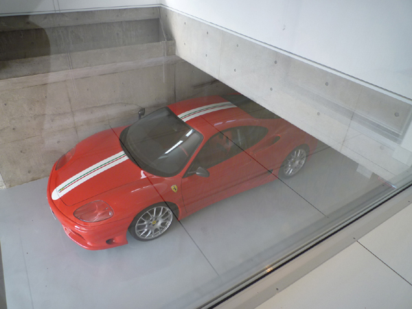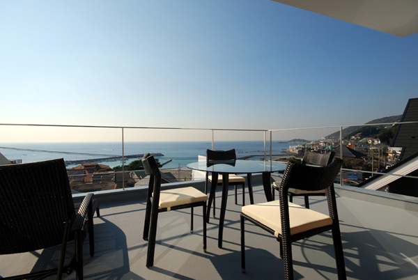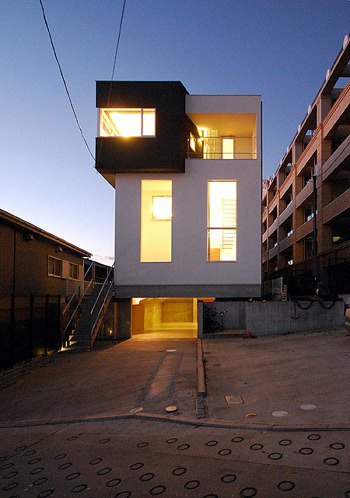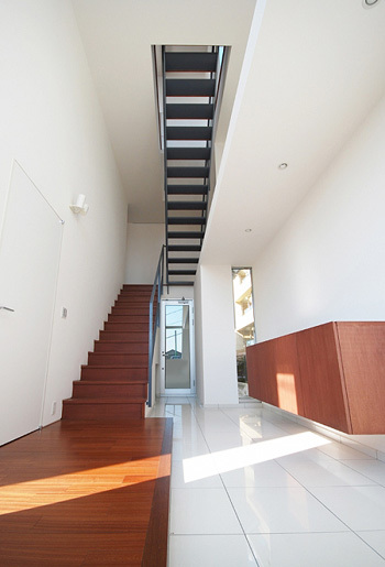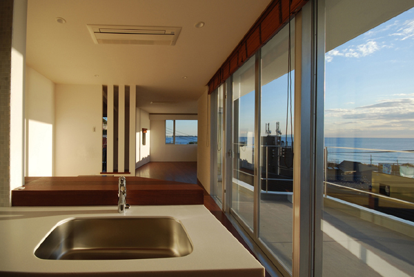 葉山に近い高台に、相模湾の眺めを最大限楽しめるよう海との間の既存建築を超える最上階リビング+テラスが求められたため、一方車がフラットに入るべき最下階との必然的な高低差により、縦長の外観となりました。