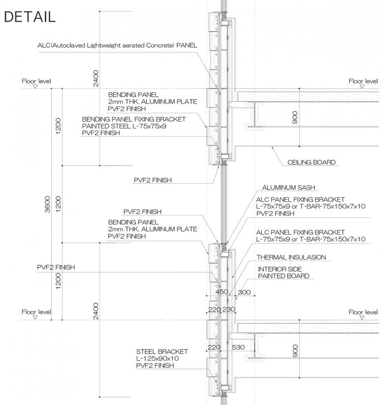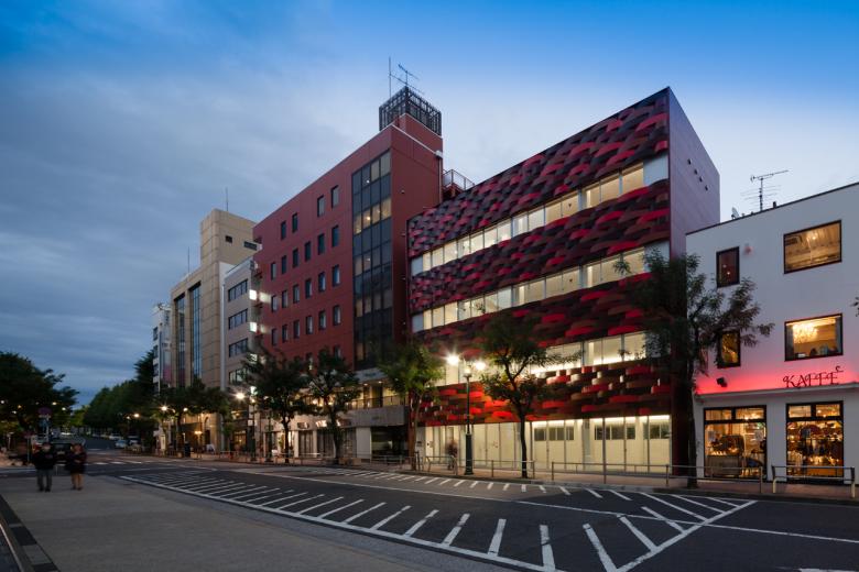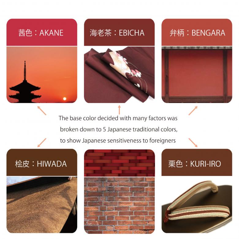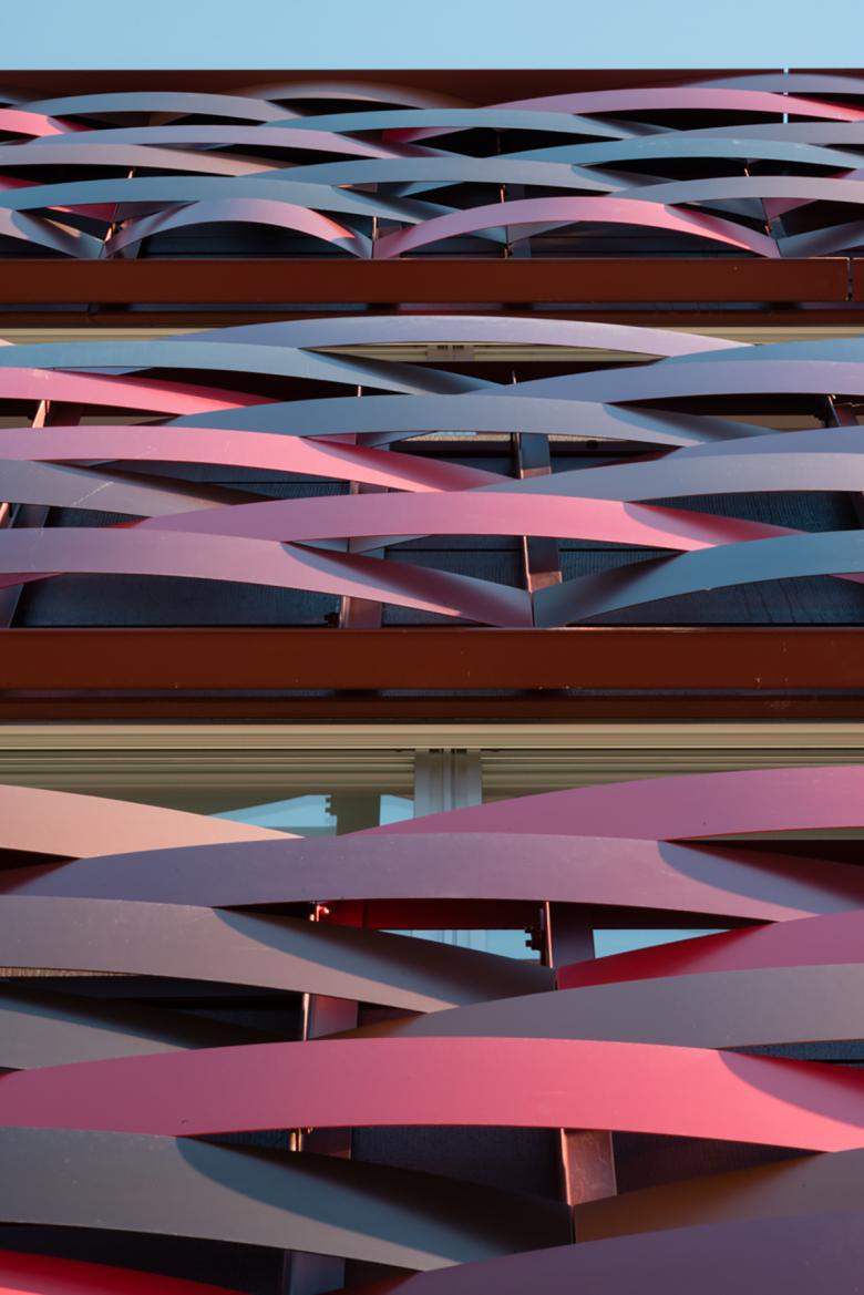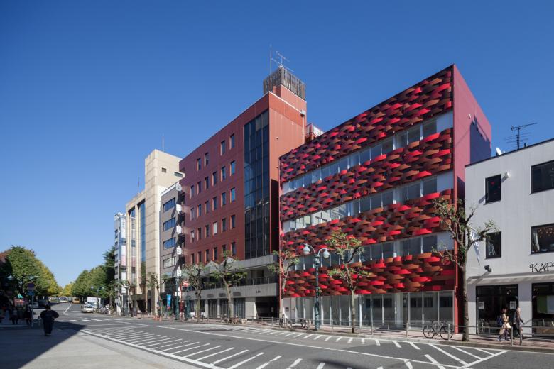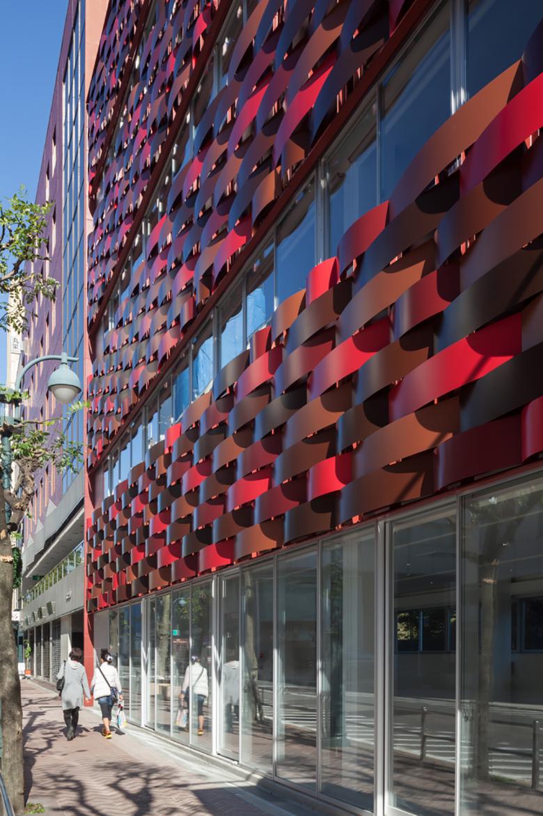 外壁への日射・紫外線を遮断させ、熱負荷と劣化を抑制するため、構造やメンテに負担をかけぬよう軽くて分解でき、風雨・温度変化にも耐えるR形状で伸縮も許容する“アルミ板すだれ ”を考え、そこに近隣景観と調和し、五輪会場へ向かう外国人に日本らしさをも感じさせる5つの伝統色を施し、鱗雲状に外壁に被せました。