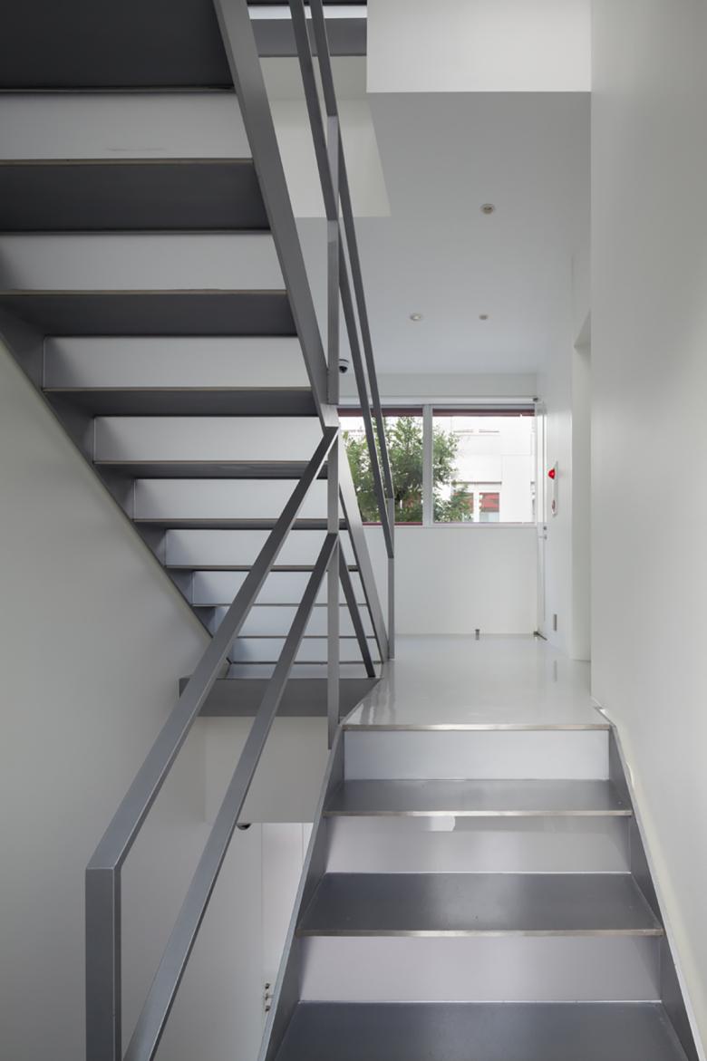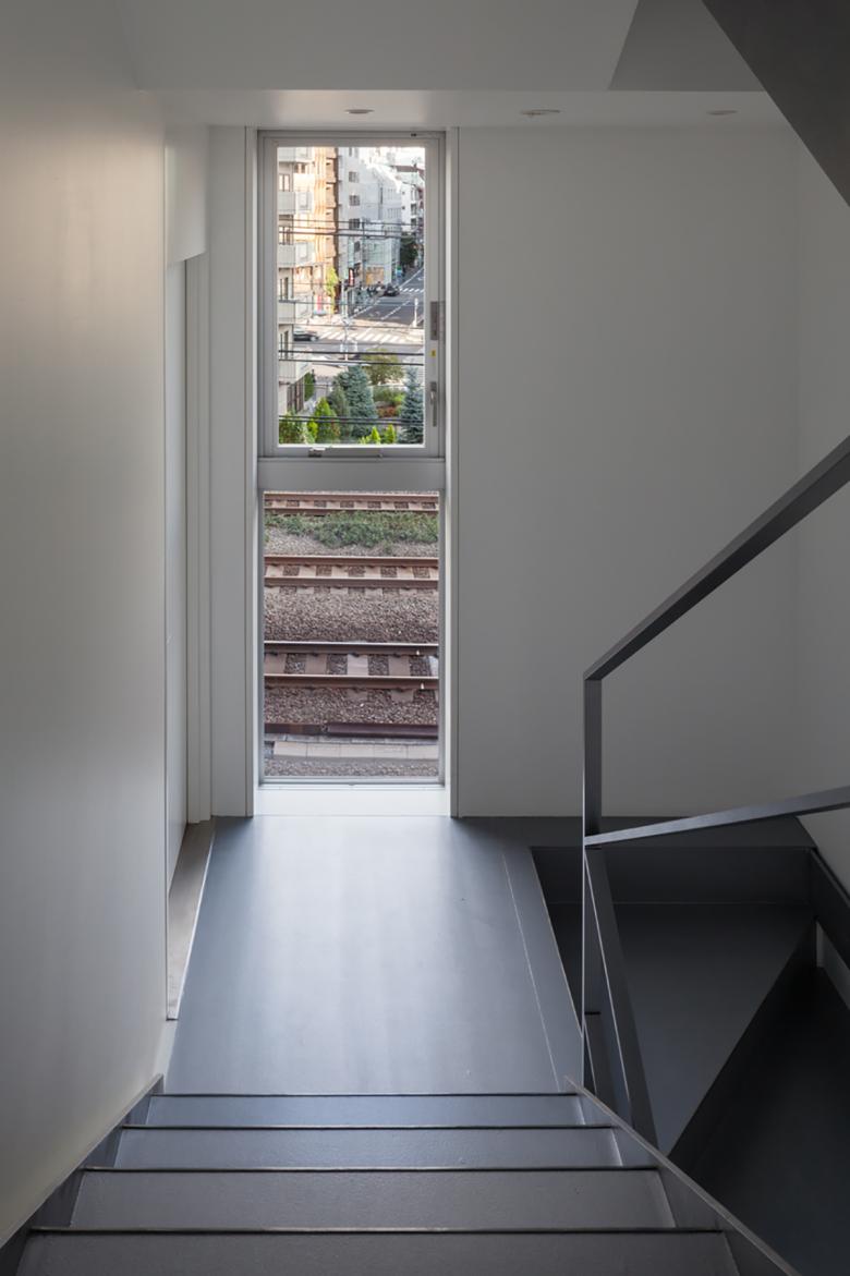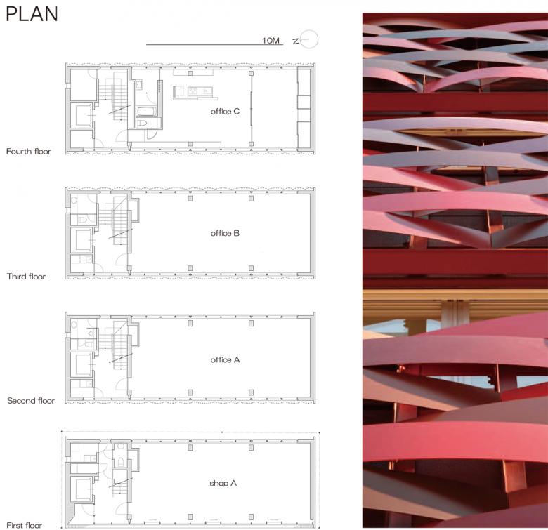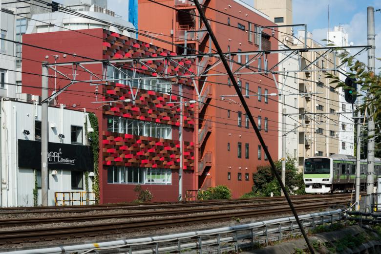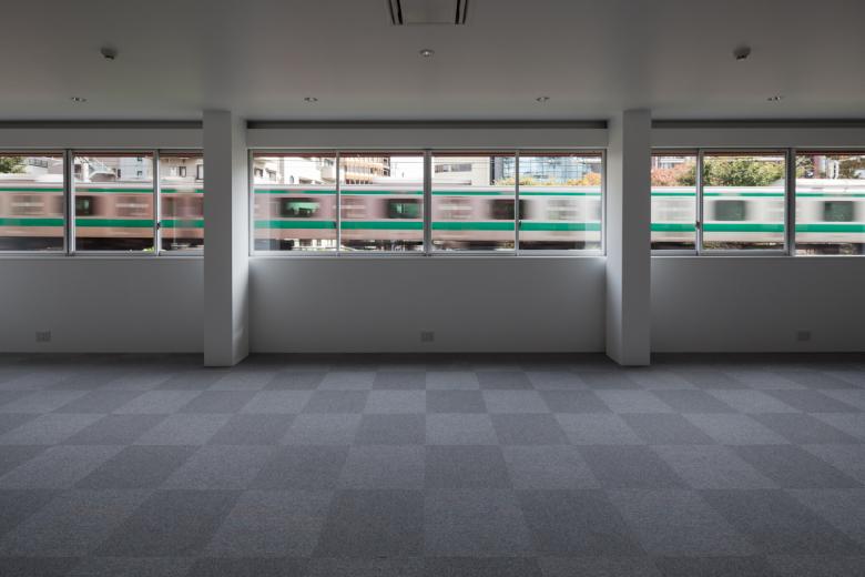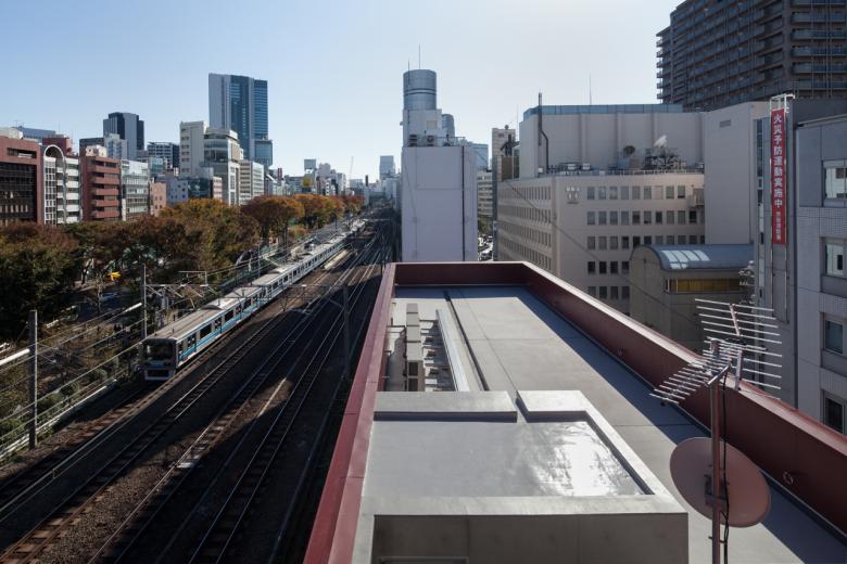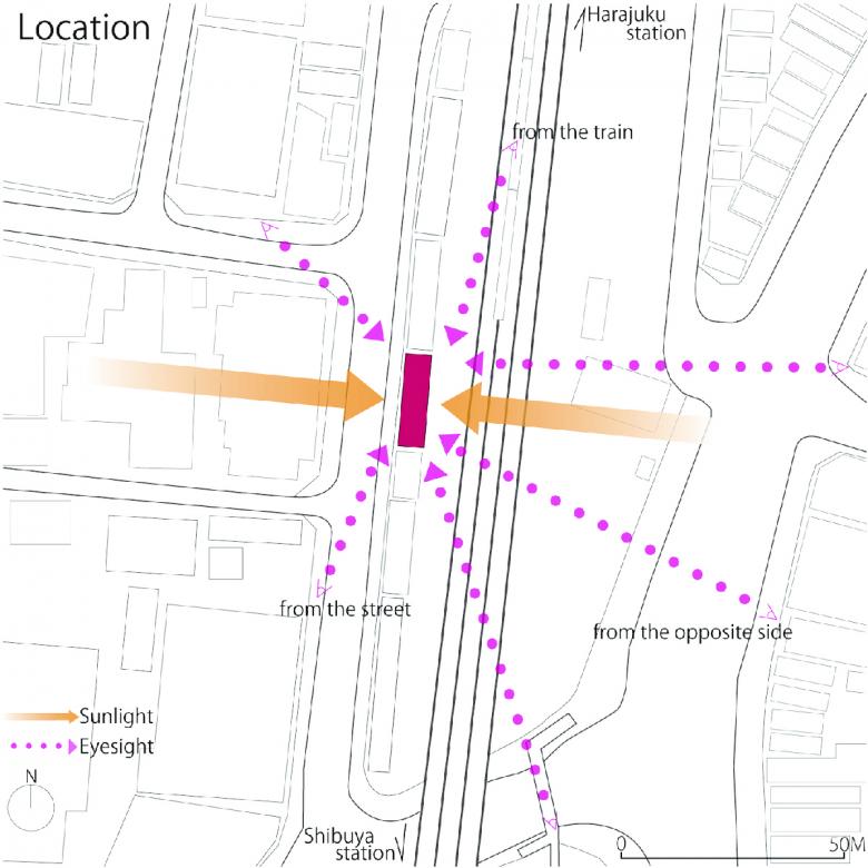 山手線沿い渋谷-原宿間の細長い敷地で、西はファイアストリート、東は線路と宮下公園に面すため、両A面となる東西立面が受ける日射と視線、及び執務環境に配慮した、4階建てのテナントビル。