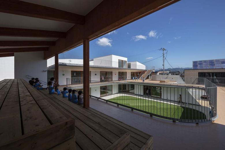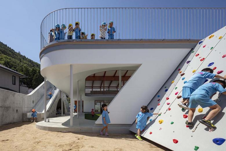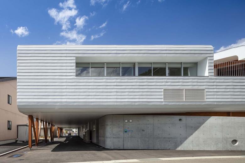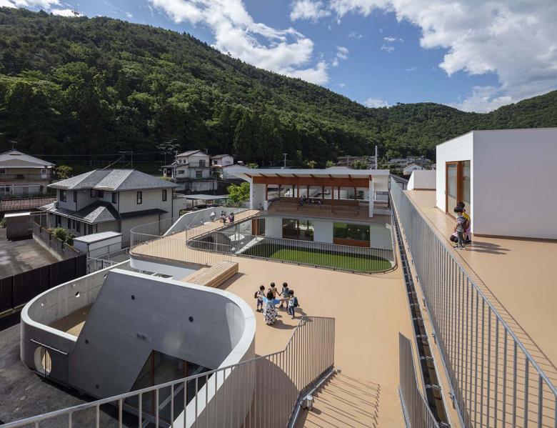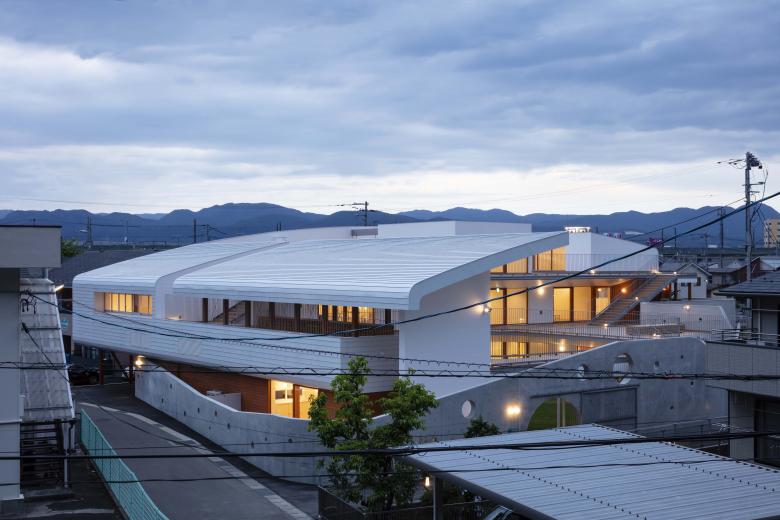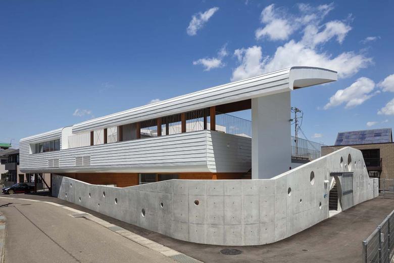 建築は雄大な信夫山の景観を取り込むべく西に閉じ東に開かれ、行き止まりのない回遊動線に滑り台やボルダリング壁のとりつく“巨大遊具”のような立体的な園舎に、防犯性や視線を調整する穴の開いたグレーの壁が上下しながら巻き付く構成。基壇はRC、目や手に近い部分は木、屋根や外周は金属鋼板と、素材も適切に使い分けた上、使い手が今後手を加えていける余地も残しました。