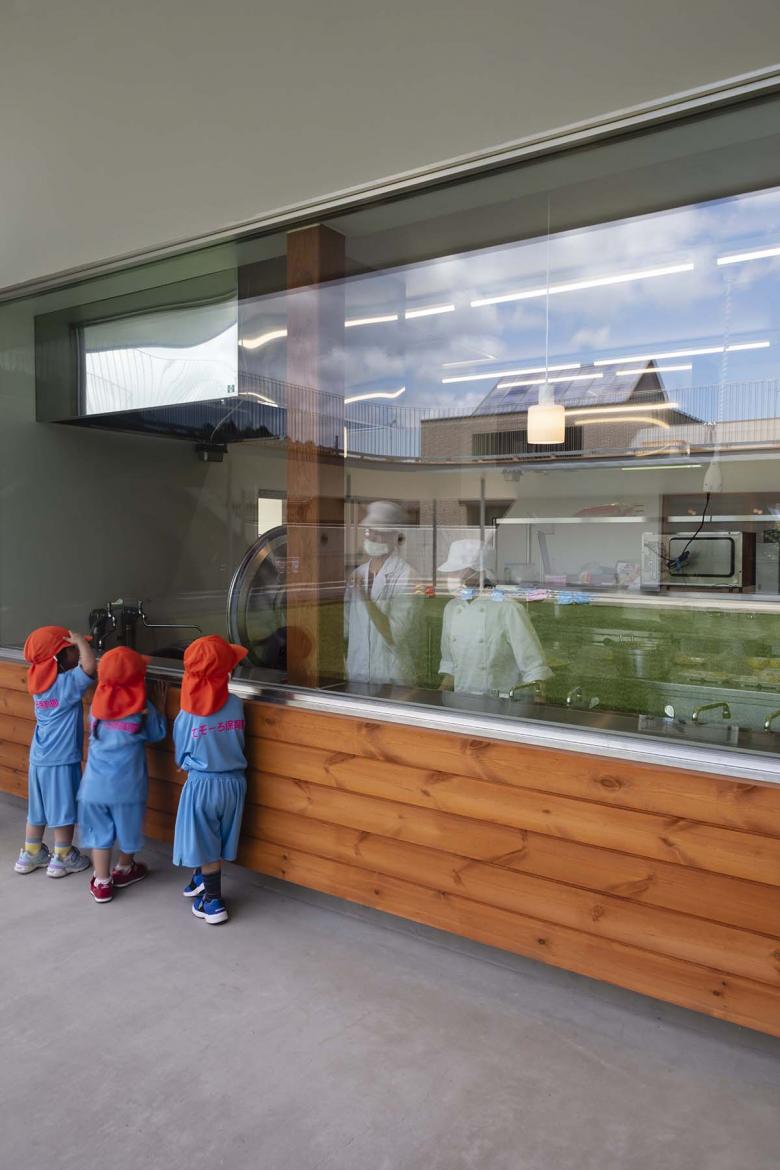 調理室 / 子どもも中を覗き込める大窓で食育に寄与