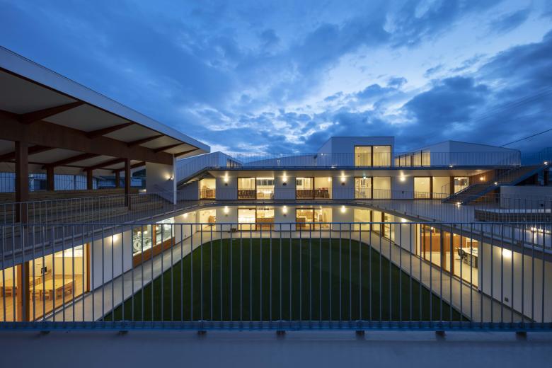 中庭(夜景)/ 子どもの滞在時間の長い施設のため低い色温度の照明計画