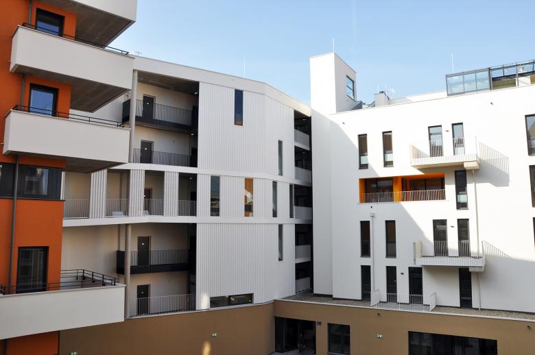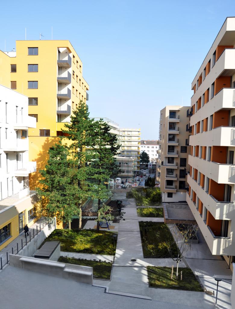 Auf der Liegenschaft des rund 10.000 m2 großen, mittig gelegenen Bauplatzes entstand ein hochqualitatives Wohnquartier mit sechs unterschiedlichen Baukörpern in geschlossener Bauweise und insgesamt 219 Wohneinheiten, wovon 93 als SMART-Wohnungen ausgeführt wurden.