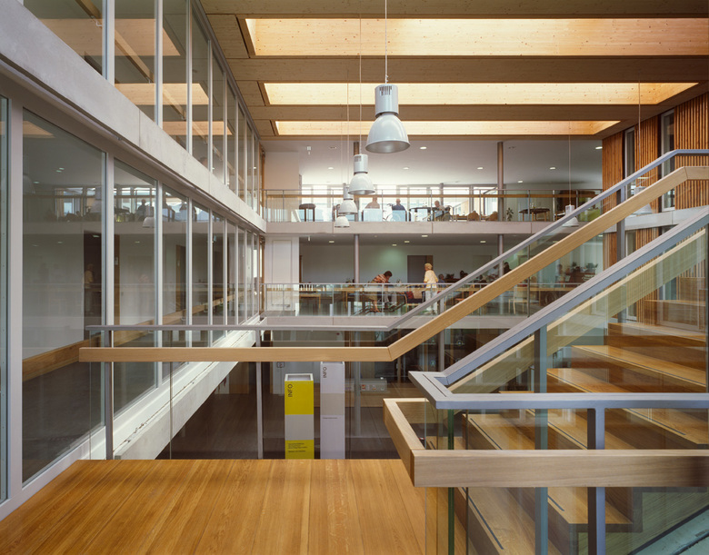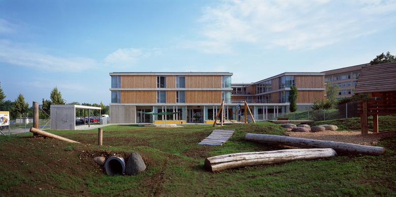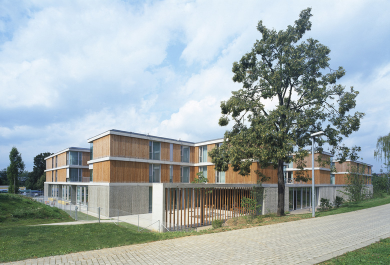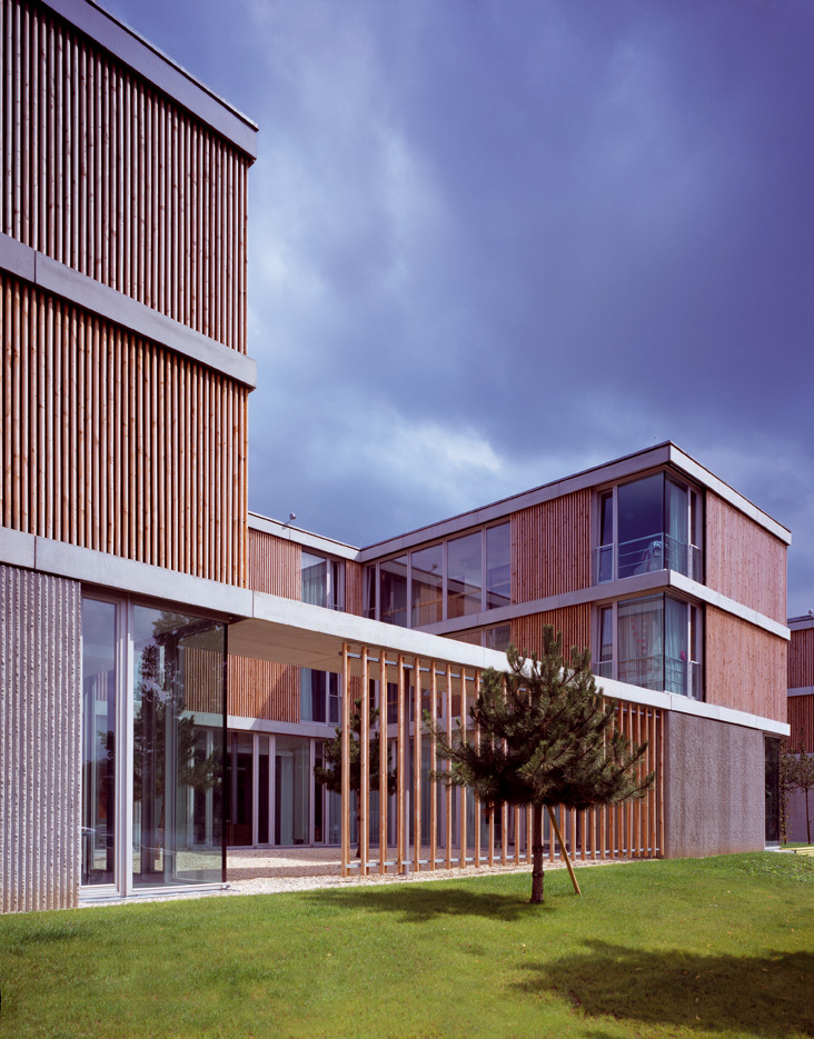Der massive Rohbau ist mit einer wärmedämmenden Hülle und einer hinterlüfteten Holzverkleidung versehen. Die technischen Standards werden durch ein Blockheizkraftwerk, Wärmerückgewinnung bei notwendigen RLT-Anlagen und Regenwassernutzung bestimmt.
