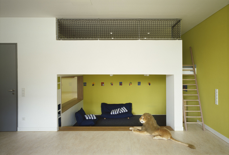 Der Weg durch das Gebäude lässt den Bewohner und den Besucher wechselnde räumliche Maßstäbe erleben. So werden die Atrien, Höfe und der Marktplatz in ihren räumlichen Proportionen als überschaubare Platzelemente wahrgenommen. In diesen Platzräumen kann eine kommunikative Atmosphäre entstehen. Die Patios, Dachgärten und Freiräume in den oberen Geschossen der Bildungsstätte und der Altenpflegeeinrichtung werden hingegen als private Kommunikationsräume von kleineren Gruppen verstanden. Die räumliche Einheit des Zimmers und des Unterrichtsraumes bezieht sich auf sich selbst und hat wiederum direkten Kontakt zu den Freiräumen der Kleingruppe. Alte Menschen, deren Situation von Immobilität bei geistiger Aufmerksamkeit geprägt ist, können über die Hofräume und den Marktplatz an den Tätigkeiten und Bewegungen der anderen Nutzer teilhaben.