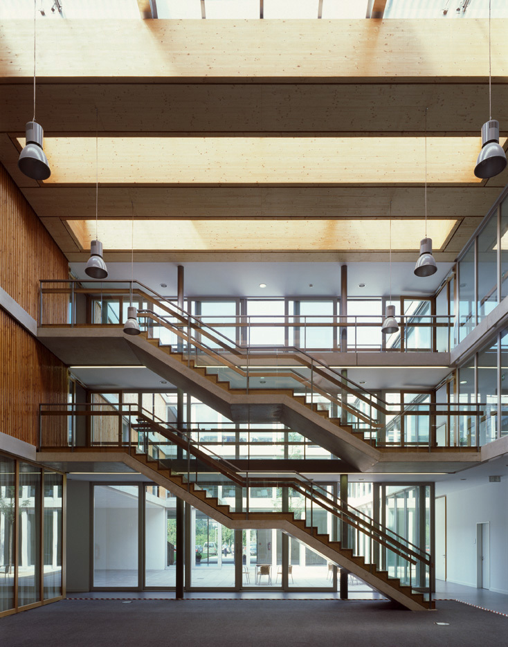 Die vertikale Durchdringung des Gebäudes mit Licht und Raum fördert vielfältige Blickbeziehungen zwischen allen Geschossen und allen Nutzungsbereichen. Auf den Geschossen selbst entstehen enge Verflechtungen. Beispielsweise können direkte Beziehungen zwischen den Unterrichtsräumen der Bildungsstätte und der Altenpflegeeinrichtung hergestellt werden. Auf die Theorie folgt die praktische Anwendung in der direkten Nachbarschaft. Im Erdgeschoss sind Nutzungen öffentlichen Charakters angeordnet: Marktplatz, Gastronomie, Küche und Lehrküche, Kindergarten und Verwaltung stehen in wechselseitigen Beziehungen.