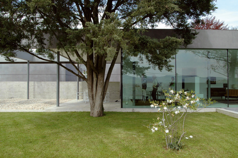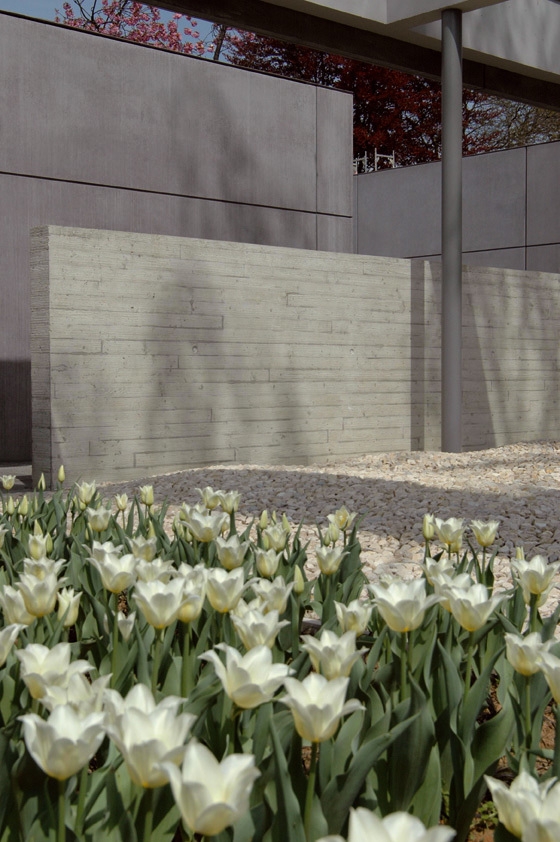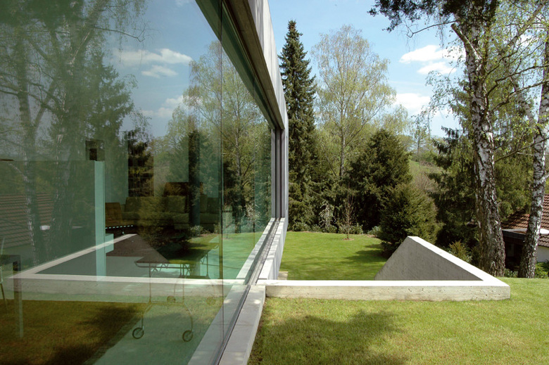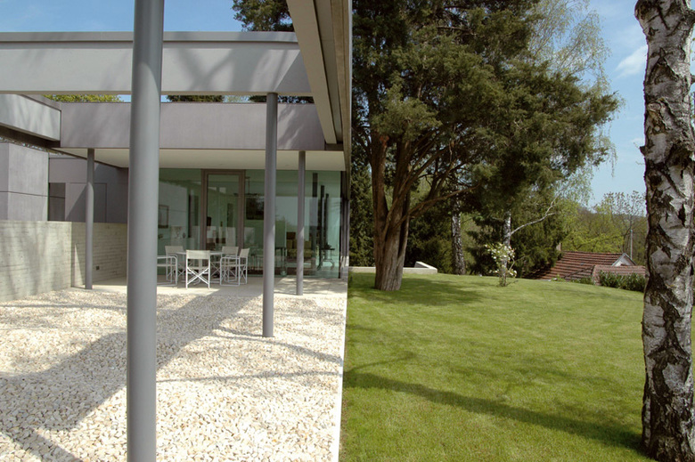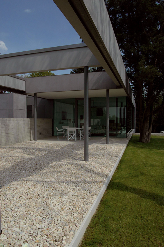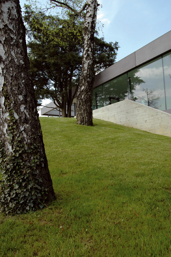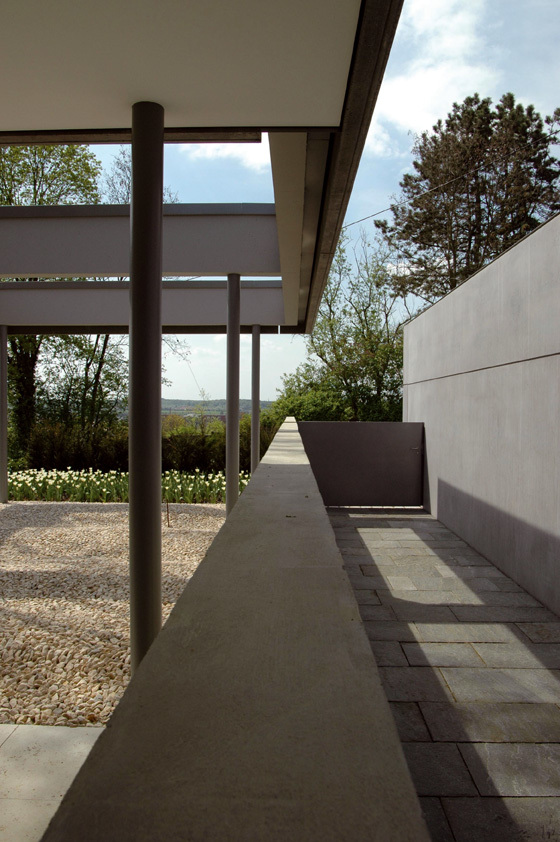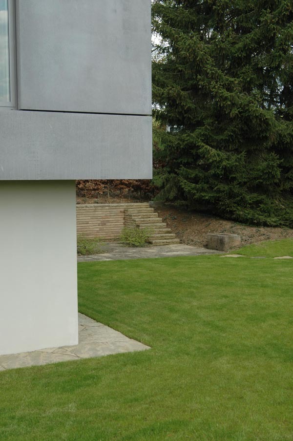 Das Haus F in Kirchheim/Teck liegt hoch über der Stadt und ist sowohl zum Ort als auch zum Panorama der Schwäbischen Alb hin ausgerichtet. Folgerichtig ist der Grundriss auf einer offenen Struktur aufgebaut, mit Aufenthaltsräumen zur Aussicht und einem Rücken dienender Räume nach Norden. Der architektonische Reiz des Gebäudes entwickelt sich aus der Dialektik des Innen und Aussen. Übergeordnet fließen die Räume zusammen, im Detail erfolgen scharfe Abgrenzungen zwischen präziser Architektur, geformtem Garten und natürlicher Topographie. Der Choreographie des Raumes folgt die Materialisierung von Architektur und Landschaftsgestaltung.