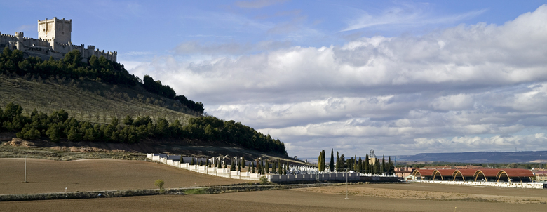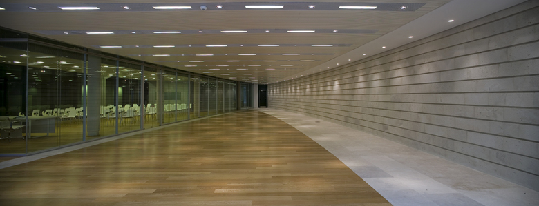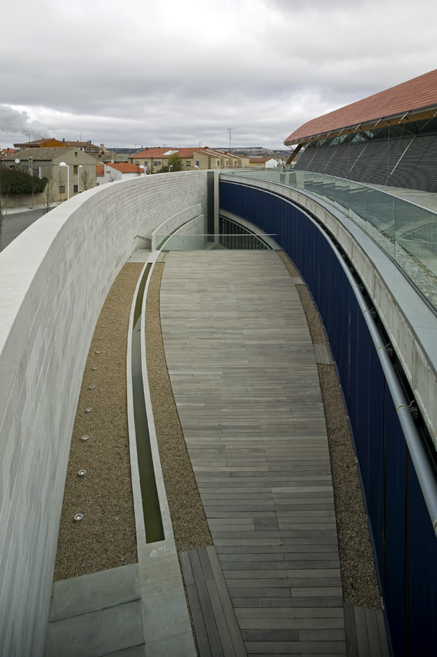 Protos' new facilities consist of a new winery and headquarters for social and managerial representation. The building, answering to the critical special and environmental conditions necessary for the elaboration of the wine, is representative of Protos’ brand and joins Peñafiel's surroundings, providing solutions that minimize the consumption of the energy necessary to maintain optimal conditions. Energy saving is not only important, but inherent to its design. The new building connects with the former wine cellars (located in a series of long corridors under the mountain of the historical and brightly restored Castle of Peñafiel, future Museum of Wine) through a tunnel built under the divider road. The base of the building is buried, taking advantage of the thermal inertia and placing the areas for production and maturation of the wine, interpreting in a contemporary tone the traditional construction of the wineries. Anchored in the area, this base regularizes the topography, creating a support for the light covering that rests over it. This light covering is formed by a structure of parabolic arches of laminated wood, reinterpreting the construction of ship-shaped wine cellars. Its consideration as a façade, regarding the sights from the Castle of Peñafiel, becomes vital in the architectural composition of the building. The volumetric treatment joins the environment, in balance with the different scales. If every city has an environmental, visual or landscaping characteristic, Peñafiel finds its own feature reflected in the brown reddish colour of the sloping ceramic decks of its facilities. Having a deck that joins such colour and material was a fundamental premise in the design; a double skin in the fifth façade. In association with Richard Rogers Partnership