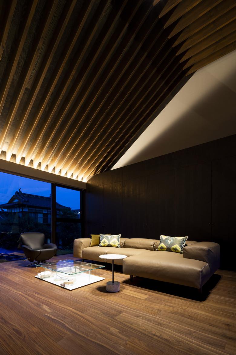 大きな吹き抜けやロフトと一体になった2階は、天井高を活かしたリビング空間として機能する空間。垂木現わしと一体化した軒先の繊細な連続感が空間に広がりをつくりだし、夜には間接照明の効果による優しい光が空間全体を包み込み幻想的である。一階のレストランでの食事の後はここで寛ぐことができる、いわばオーベルジュのような家である。