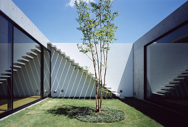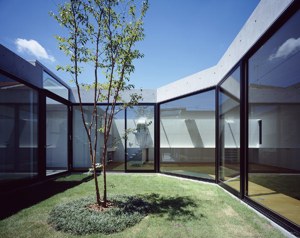 100坪の敷地に計画した平屋にはプライバシーを考慮しつつ、内部に大小異なる4つの庭を散りばめた。アプローチからエントランスまでの通り庭、リビング ダイニング、寝室に面する大きなセンターコート、客間と水廻りの間に設けた坪庭、そして太陽光パネルを搭載した屋上庭園である。あらゆる場所から異なる性 質の庭を望めることで、家に居ながら自然と対峙し、昼夜を通して光や風を体感し、一年を通して季節感を味わうことができる。