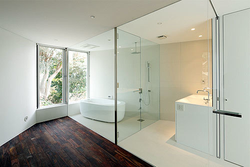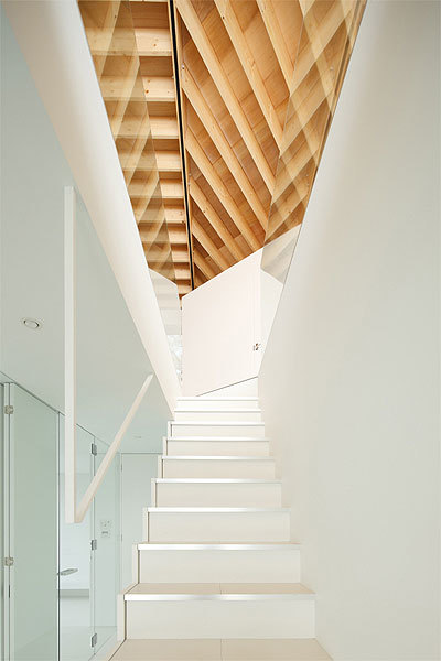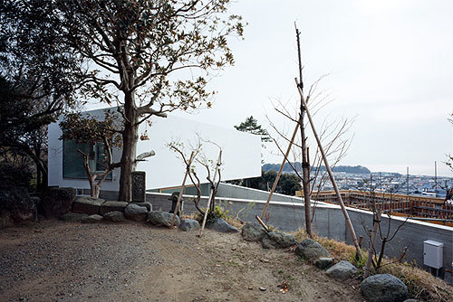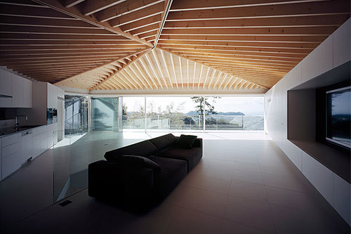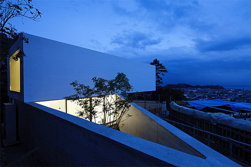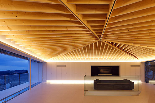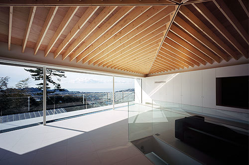 RC造の基壇に鉄骨造の白い箱がずれながら搭載された外観に木造の屋根が架かっている。1階北側の静かなアトリエに面する中庭は高塀で囲われ、プライバシーを配慮。東側には水廻りと一体になった寝室を設け、森の緑景がリゾートホテルのような非日常性を演出する。1階とは対照的に、2階にはファミリールームの大空間が広がる。計算された開口部配置によって周辺の森や目前に広がるパノラマの景色が切り取られ、壁面には収納や水廻りが整然と造りつけられている。鉄と木で構成した五角形の大屋根は、大胆かつ繊細なディテールワークでこの大空間の美しさに一役買っている。自然環境との共存、開放性と閉鎖性のバランスが本住宅のテーマである。