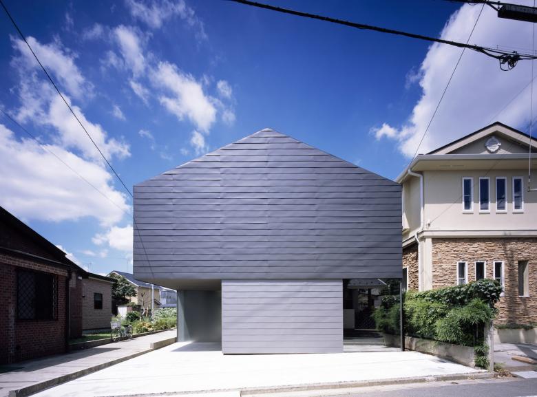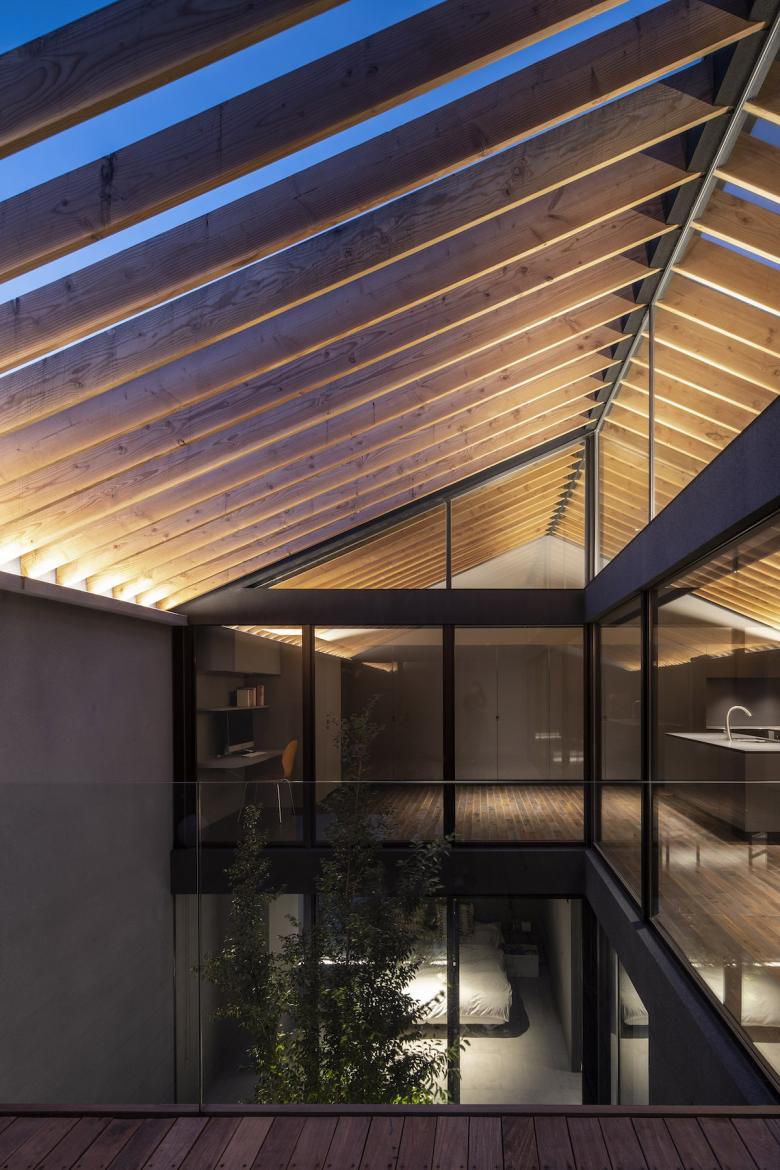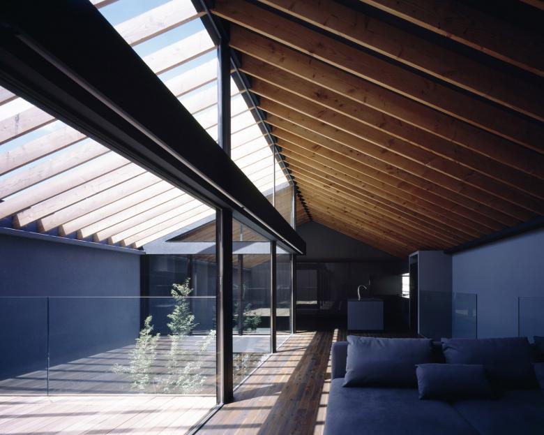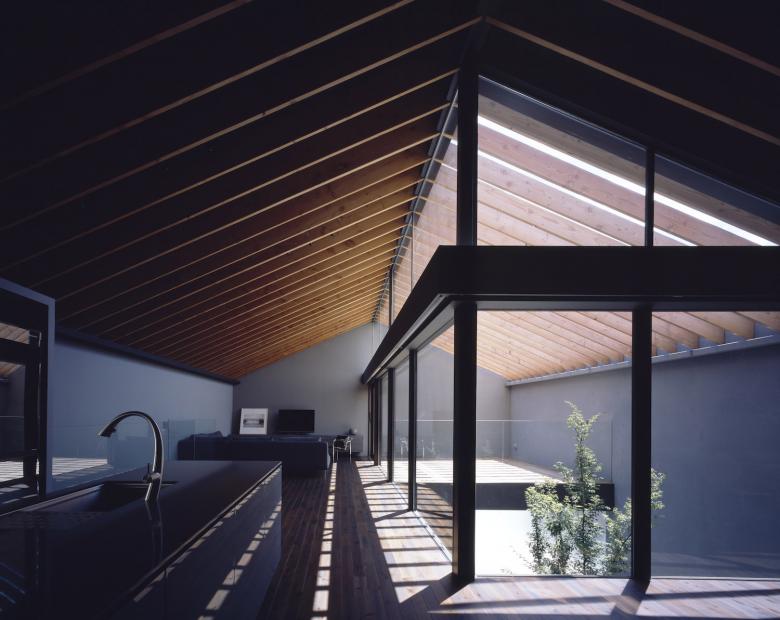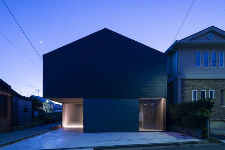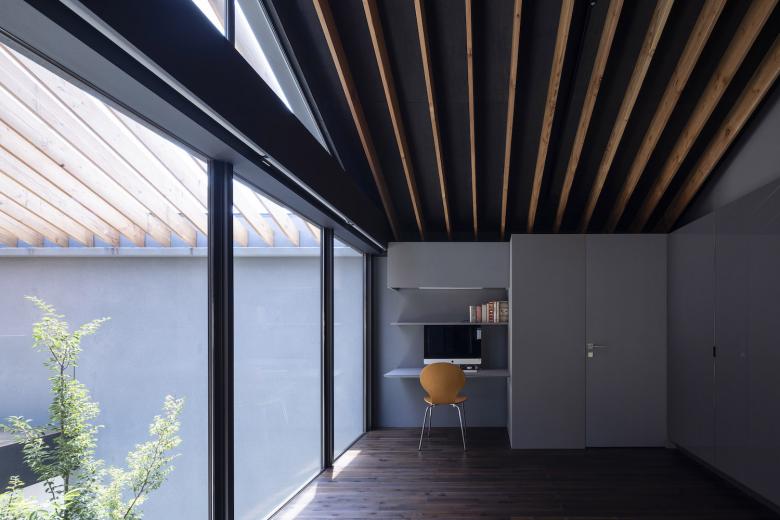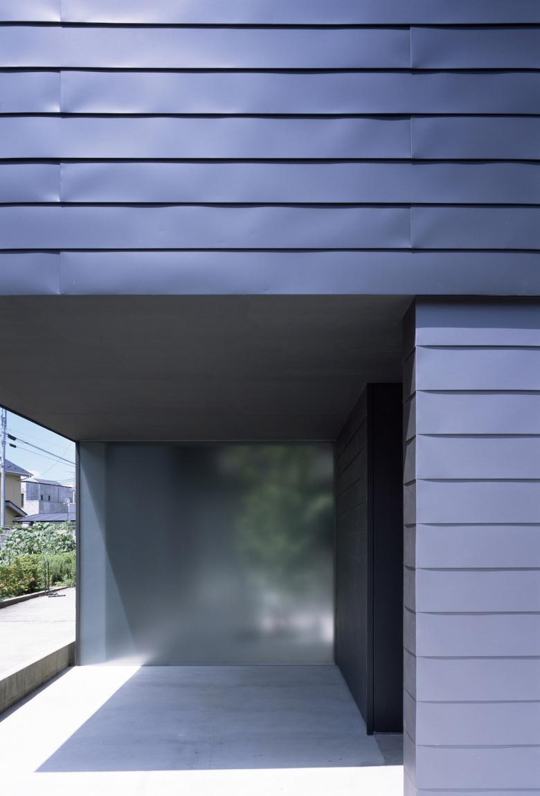 ダークグレーのガルバリウム鋼鈑の外壁と、ハーフミラーガラスで構成された閉鎖的なファサードからは内部の生活空間を想像することができないが、ひとたび内部に入ると自然光に包まれた空間が広がるというような心地よいコントラスト意識している。