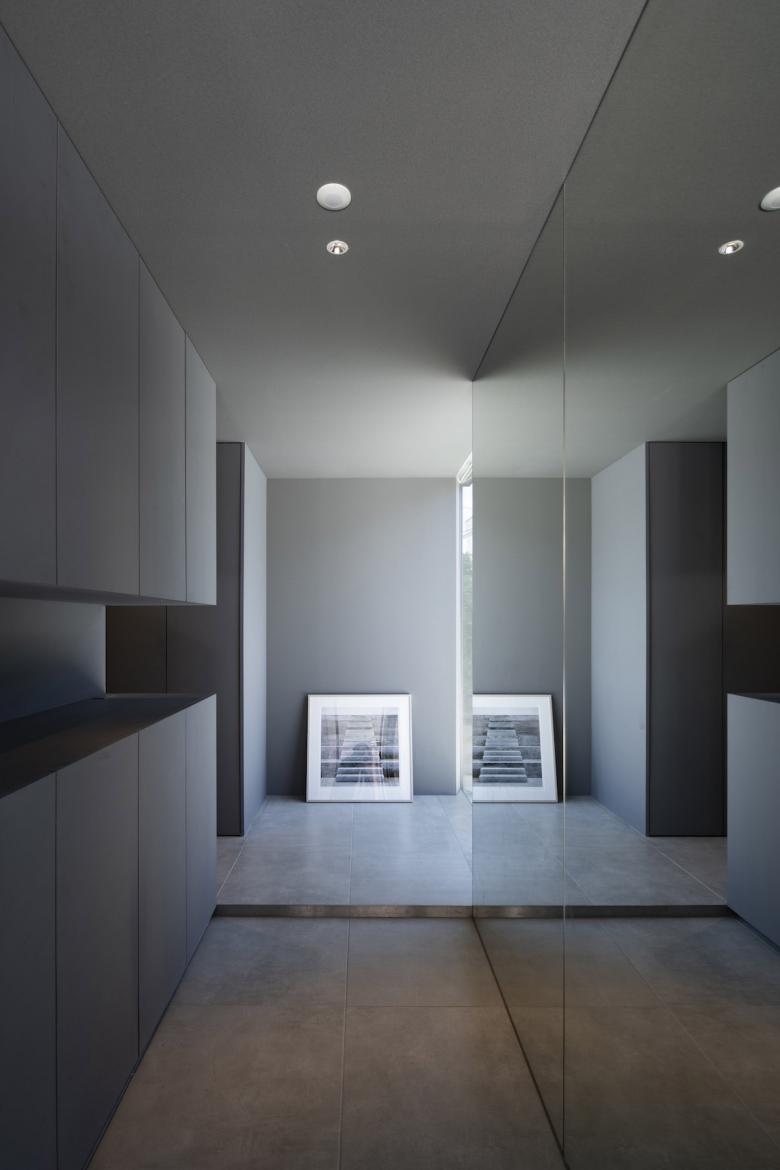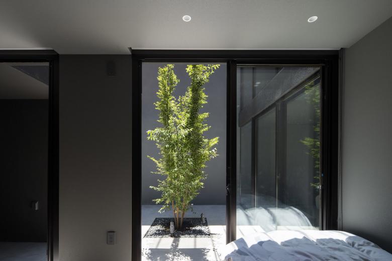 1階玄関脇にあるフルハイト窓から差し込む穏やかな光は、グレートーンを基調にしたシックなエントランスの空気をつくりあげる。中央に設けた中庭のヒメシャラを眺めながらリラックスできる主寝室と子ども室、奥にはホテルライクなバスルームを配置。プライバシーも十分に守られている。