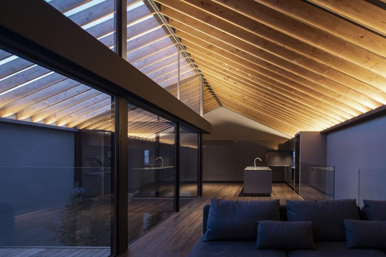 一方2階は家族全員が寛ぐパブリックルームとし、LDKの他にフリースペースや小さな書斎を設けている。天井を見上げると、この住宅最大の特徴である現しの垂木が室内から屋外に連続しパーゴラへと変化する。切妻のシンプルな屋根形状に沿って葉脈のようなストライプ模様が内外を横断することで空がトリミングされ、室内には光と影の模様が映し出されることで空間に奥行きが生まれている。