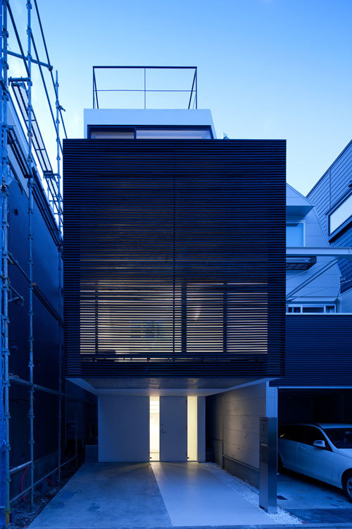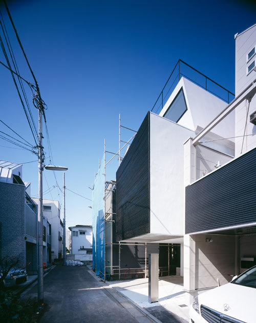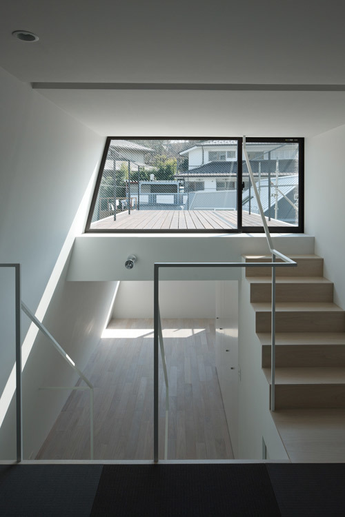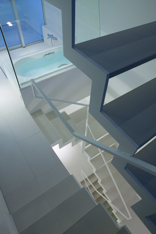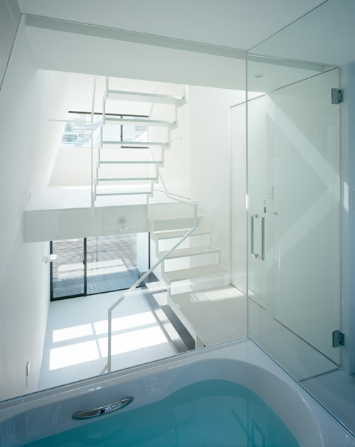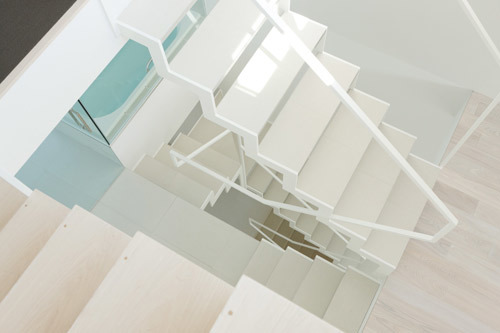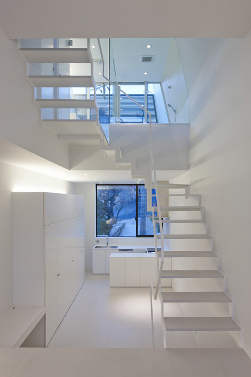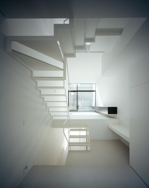 敷地は都心部にある小さな分譲地。間口が狭く、奥行きの長い「鰻の寝床」は、東京のお馴染みの敷地形状である。本計画では1台分の駐車場を確保しつつ、コンパクトながら豊かな空間を実現するための手法としてスキップフロアを採用した。特徴のある階段吹抜けを介し、地下1階から地上3階まで空間が緩やかに連続することで、階段で接続された空間どうしが密接に関わり合い、独特の一体感が生み出されている。また、全体を白に統一することで空間には抽象性が生まれ、コンパクトながらおおらかなスケールが感じられる手法も、狭小住宅ではもはや常套手段といえよう。空間の中心を貫くスパイラル階段の上部に配したハイサイドライトからは柔らかな光が降り注ぎ、内部空間を隅々まで満たしてくれる。縦に広がる都市空間 を散歩するような一つの風景がこの小さな住宅内に実現されている。