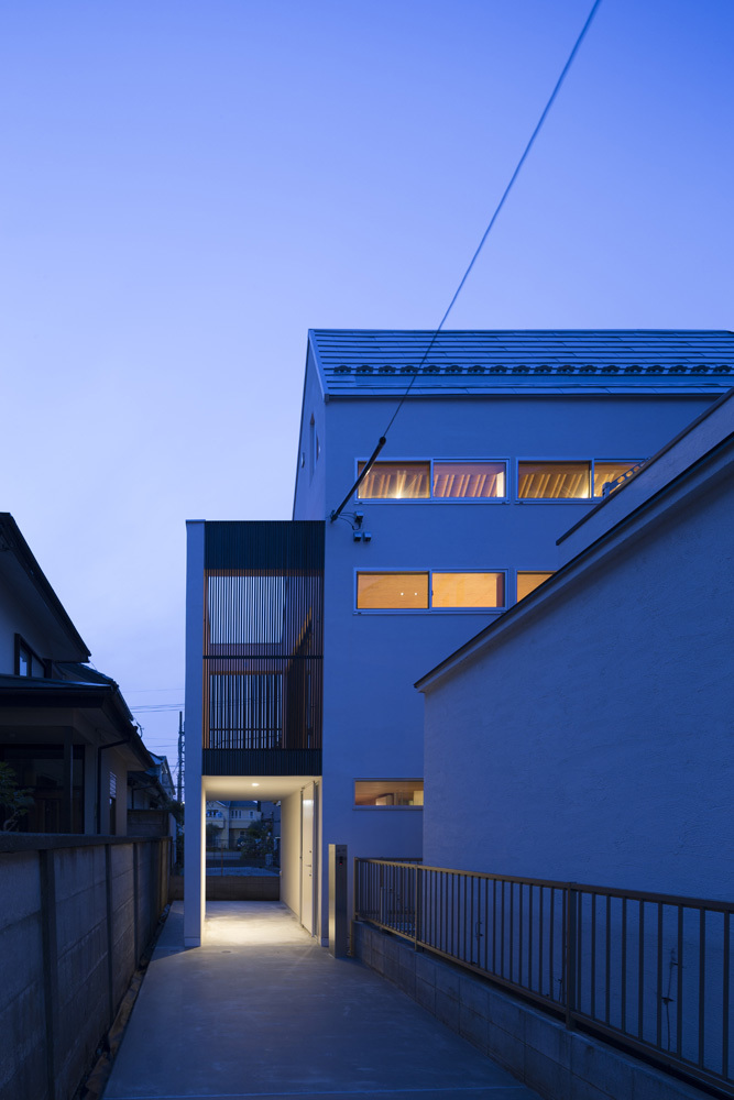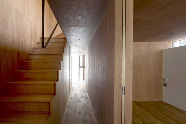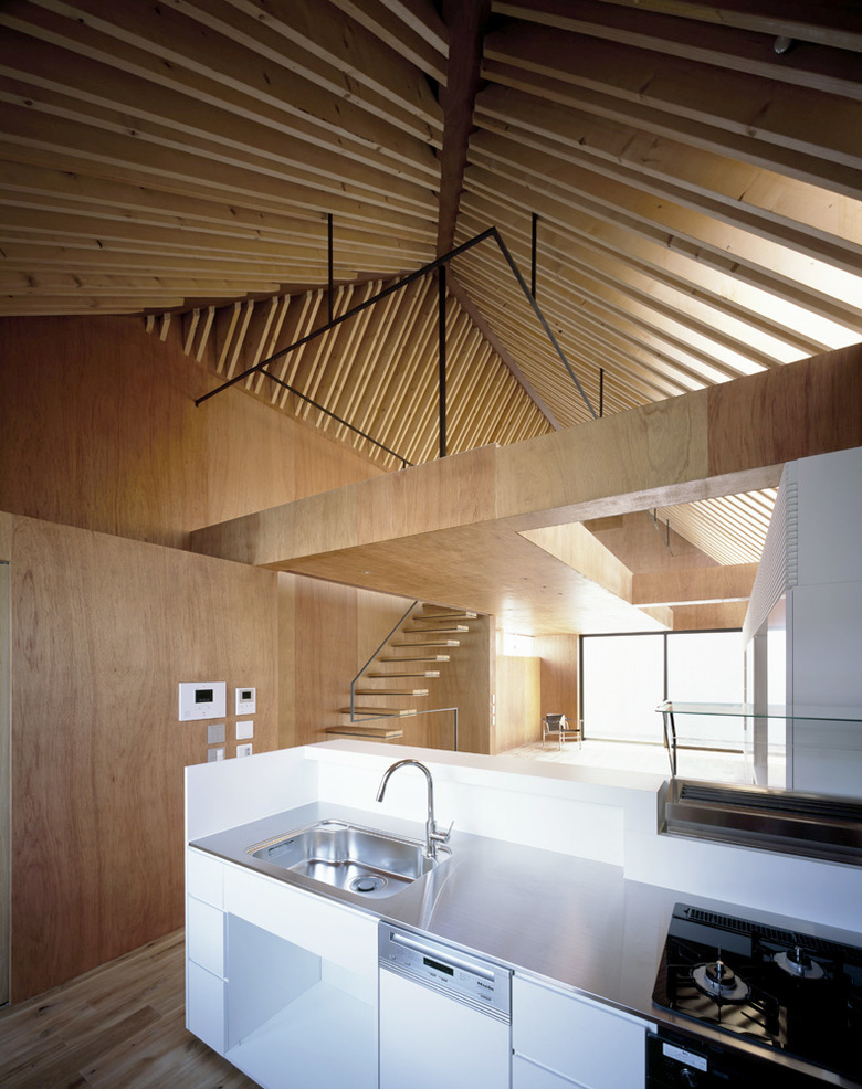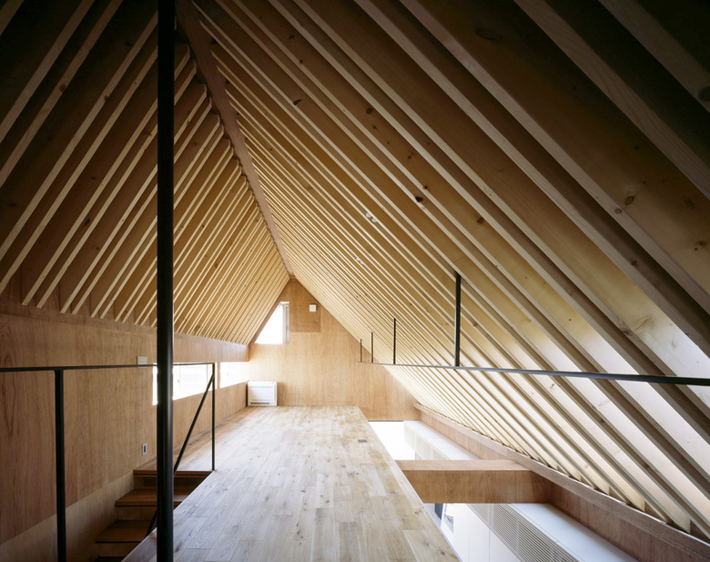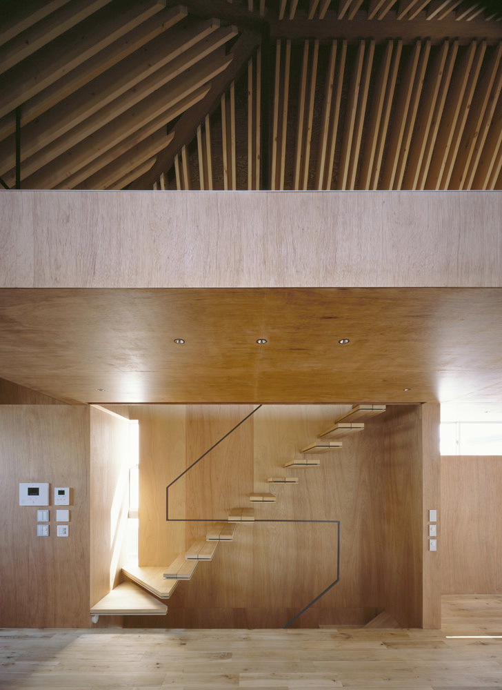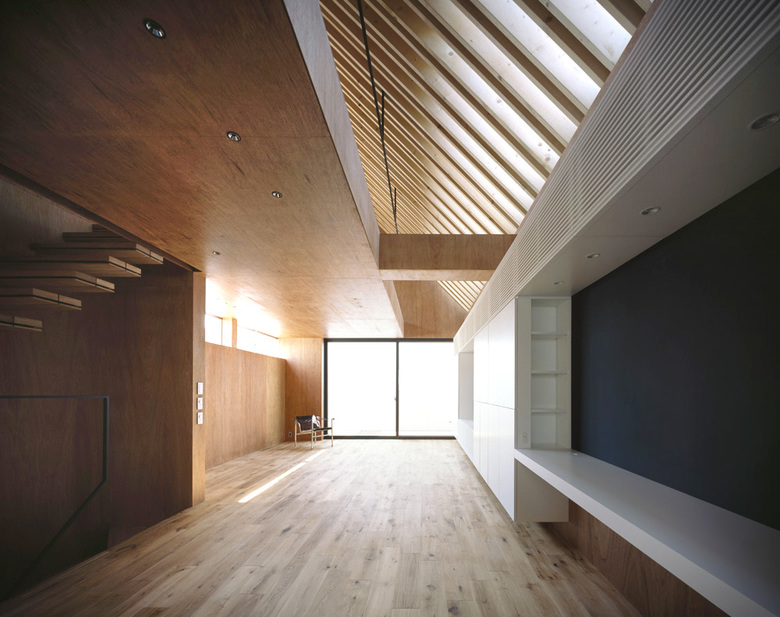 旗竿敷地で四方を隣家に囲まれ、3方向から厳しい斜線制限を受けることから、内部には複雑な屋根形状の空間が広がっている。家族全員の大きな寝室や収納、水廻りをコンパクトにまとめた1階部分とは対称的に、二階は家族全員がゆったり過ごせるおおらかなワンルーム空間を配した。屋根にはSPFを2枚一組で構成した垂木を意匠として現わし、急勾配を生かしたダイナミックな傾斜天井とすることで、空間には繊細さと大胆さの二つの表情を与えている。