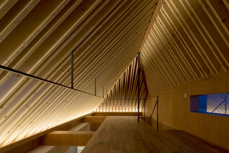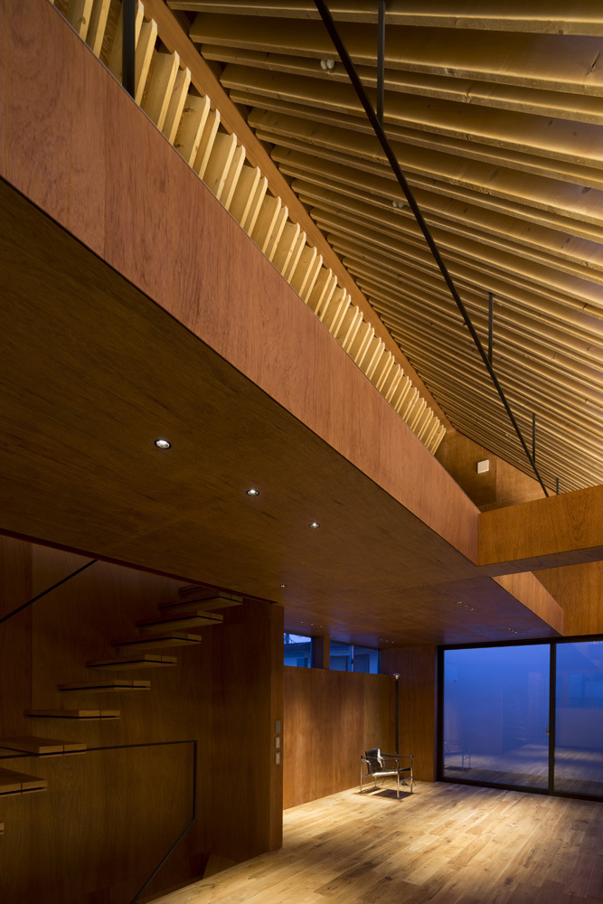 夜にはコーブ照明により垂木が照らされ、昼とは異なるドラマティックな表情が広がる。登り梁を鉄骨にすることでシャー増加し、小屋裏にはあえて壁面を設けず、上部からの手摺のみとすることで空間には独特の浮遊感が生まれている。