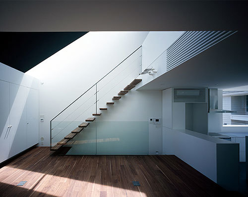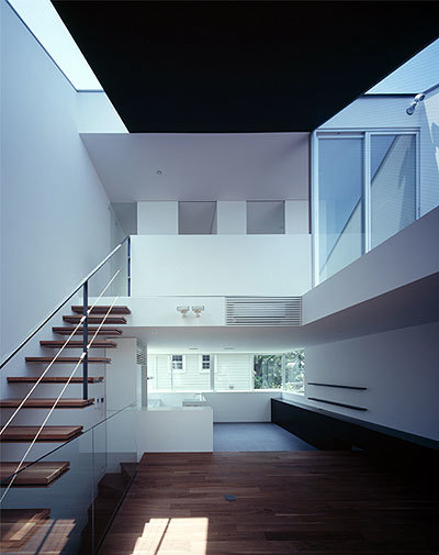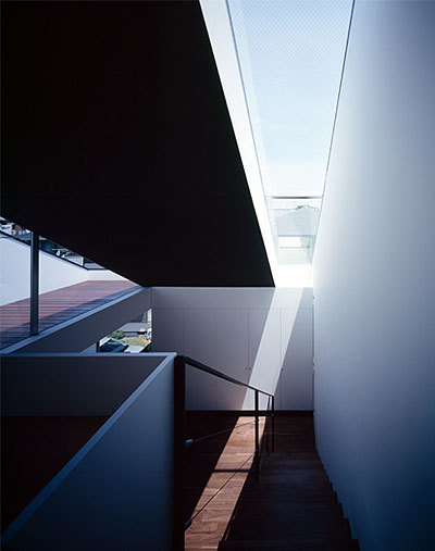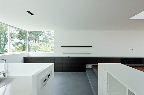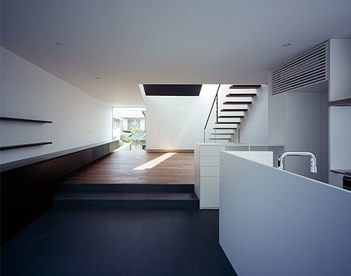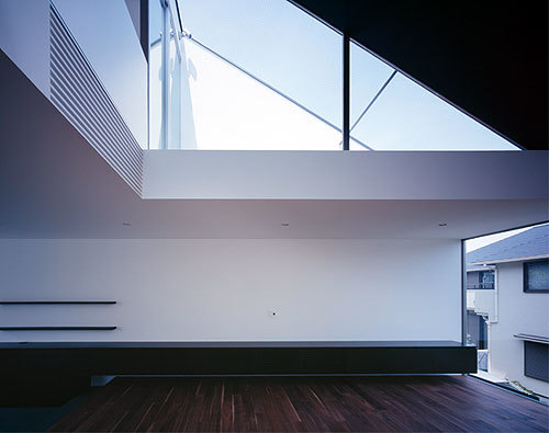 1階には主寝室と客間、ボディルームを配置し、家族の空間は日当たりの良い2階に配置した。ダイニングとリビングの間に緩やかな段差を設けたのは、単純なワンルームに変化を与える役割に加え、高台敷地周辺の空気感を内部空間にも表現したかったためである。天井をあえて低く抑えたダイニングキッチンにはのびやかな水平連窓を設け、通路側や敷地奥まで見下ろすことができる。その一方で、高い勾配天井に面したリビングは、3階の子供室やスタディルーム、ルーフバ ルコニーと吹き抜けを介して連続する大らかな空間。トップライトやハイサイドライトからはダイナミックな光が降り注ぎ、壁面に陰影を生み出す仕掛けとな り、室内からは自分達だけの空を眺めることも可能だ。建主の人柄同様、環境の力に逆らわない「素直さ」こそが、この建築で表現したかったことである。