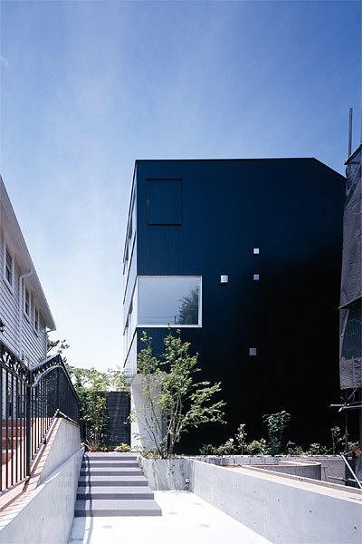 敷地は東京の都境を流れる川沿いの街。駅から程近い高台の敷地周辺には緑が溢れ、良質かつ閑静な住宅地が広がっている。40代の建て主が新たに購入した分譲地は、細長い通路の先に敷地がある「旗状敷地」であり、東京独特の敷地形状である。道路に面していない敷地はいささかネガティブな印象を抱きがちであるが私はそう考えない。むしろこの通路こそが道路と住宅を繋ぎとめる重要な緩衝帯として生かされ、パブリックとプライベートを接続させるパサージュ(街路)になると考えている。また、敷地の奥には見下ろしの緑景が広がり、借景として室内に取り込むことができる。加えて敷地周辺の景色を巧みに取り込むことや風の通り道を十分に留意しながら、配置や開口部の計画を丁寧に行っている。