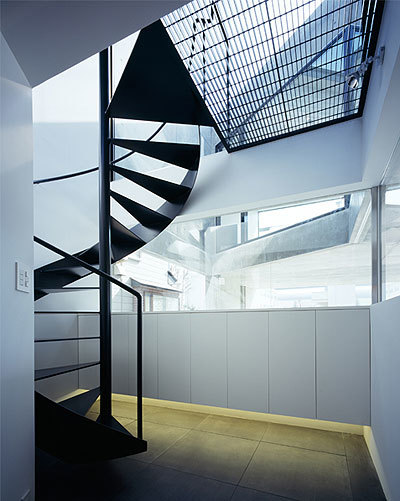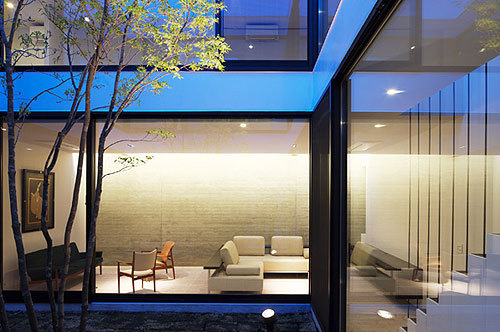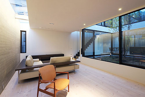 1階はリビングとダイニングキッチンが中庭を挟んで対峙。玄関の正面奥に中庭を挟んで配置した、オブジェのようなアプローチ階段は、中庭と共に伸びやかさを演出する象徴的な存在である。2階のフリールームはヨガ教室とワークルームに充て、主寝室や子供室の周辺には小さな坪庭を散在させ光や抜けを随所に確保した。吹き抜けの庭を内包した住宅は日本の四季を存分に感じることが出来る。加えて内外のコントラストによるギャップが、毎日の生活で新鮮な気持ちを維持していく原動力になるのではないだろうか。