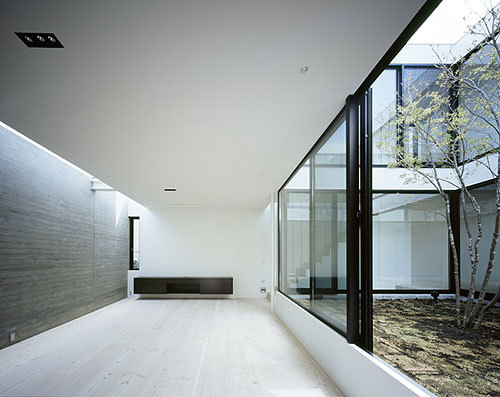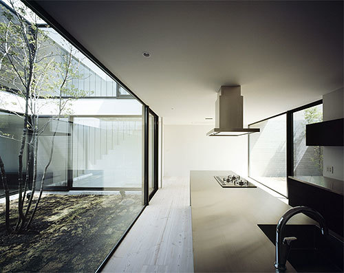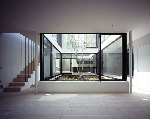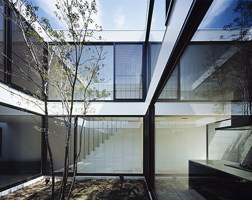 外部に閉ざした外観とは対照的に、内部は吹き抜けの中庭が中央を貫いている。ロの字型の平面は回遊性抜群で、どこにいても家族の気配を感じられる。建築の重心を担っているのが、中庭のシンボルツリーである。