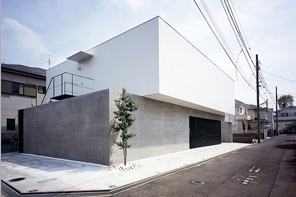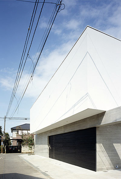 東京郊外にある敷地周辺には、豊かな緑とゆったりとした空気が流れている。建て主は保険会社を経営されるご主人とパタンナーの奥様、2人のお子さんの4人。住宅の用途と、奥様が主宰するヨガ教室のための空間をプラスした、SOHOの計画である。杉板型枠化粧打ち放しコンクリートで覆われた1階基壇の上に、光触媒の外壁で覆われた木造のボリュームが搭載されたような外観が特徴的だ。