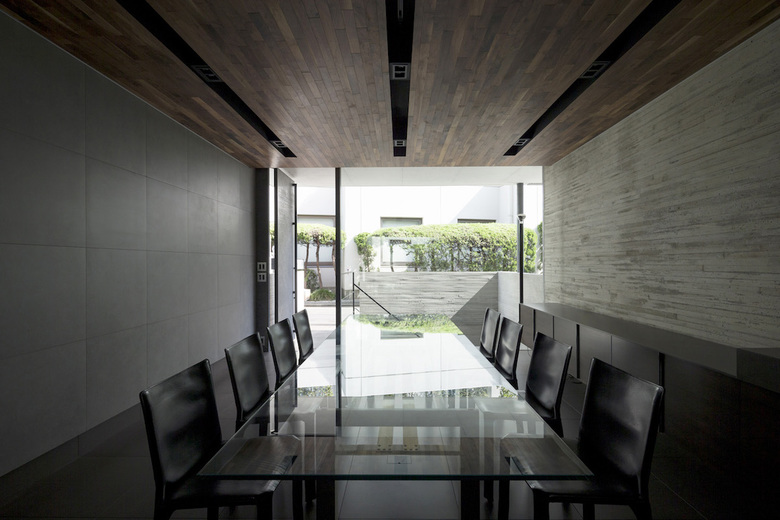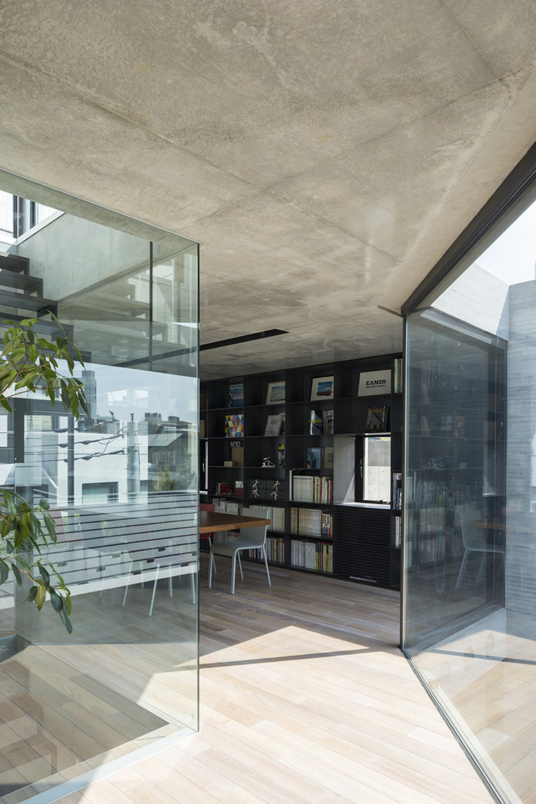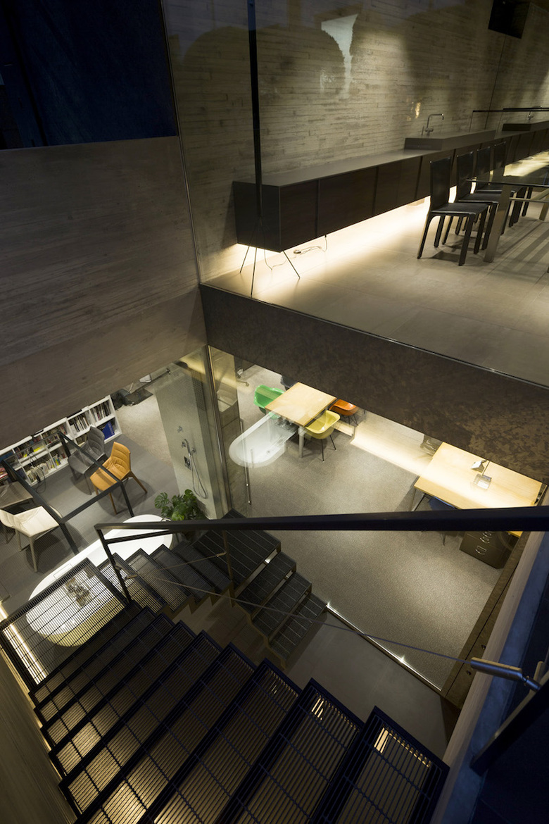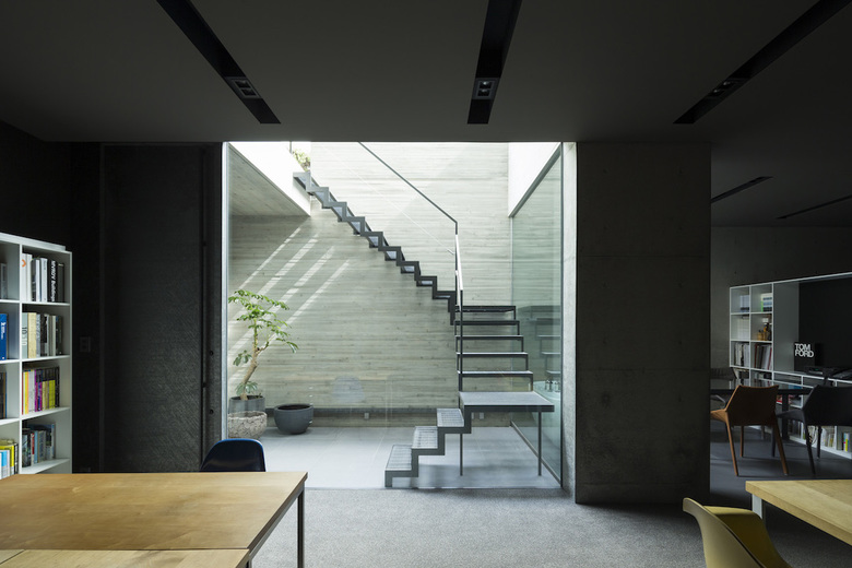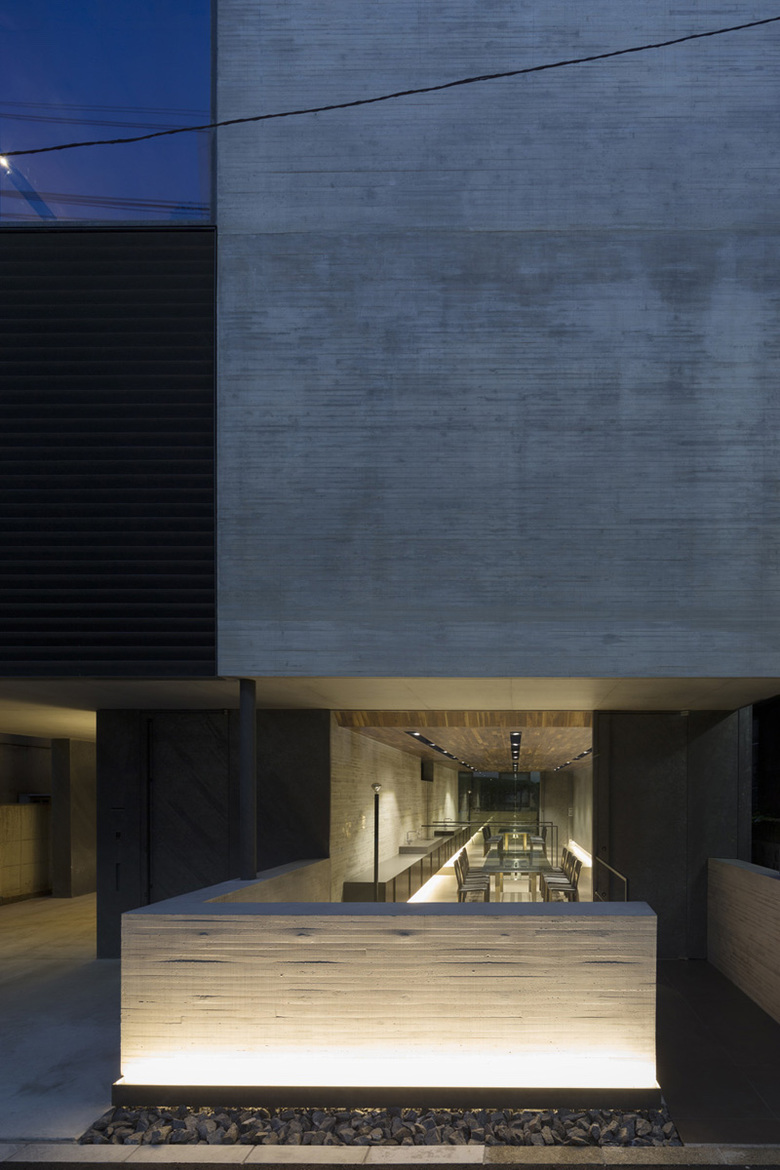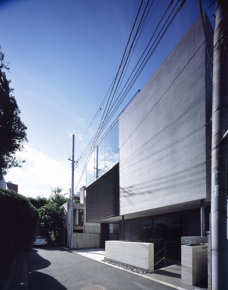 あくまでオフィスとしてのシンプルなファサードを実現するため、北東側道路面には40ミリの杉板型枠RC打ち放しの壁面と、溶融亜鉛メッキリン酸処理のルーバー材とハーフミラーガラスを組み合わせることで洗練された印象とした。地下1階のオフィス部分にはドライエリアを介して北東側の拡散光が充満し、1階は大きな窓ガラスのある路面ギャラリーとして機能する。