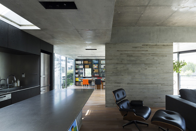 3階の西側には天井の高いリビングキッチンと、東側にはダイニングを兼ねたライブラリーをワンルーム状に配置することで家族が互いに気配を感じつつリズミカルな生活が堪能できる。