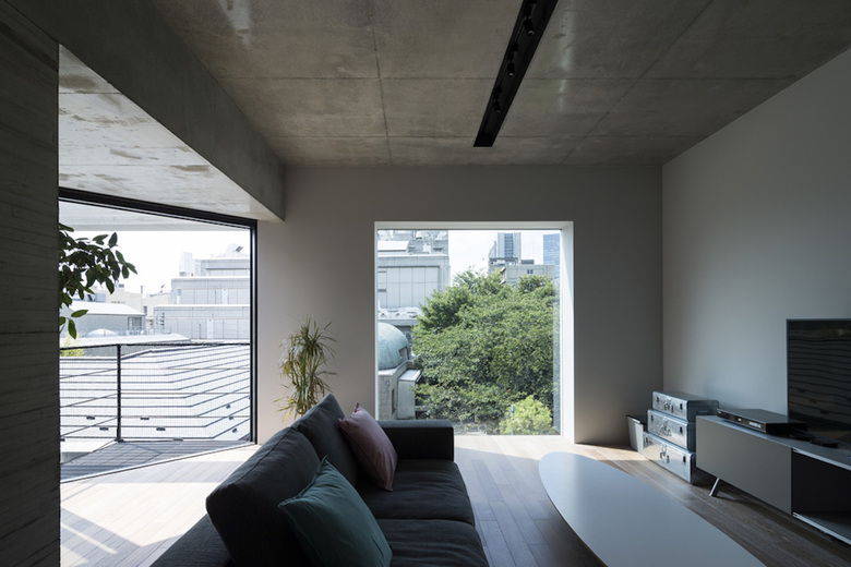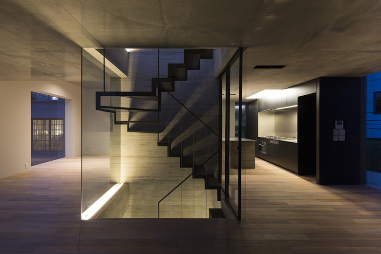 敷地周辺は東京屈指のエリアとして知られる港区青山。30代の建主夫妻は袋小路の奥に併用住宅を建設し、賃料収入を得ながらの生活を求めた。地下1階と1階の一部を賃貸オフィスとし、2、3階をオーナー住居とする計画だ。