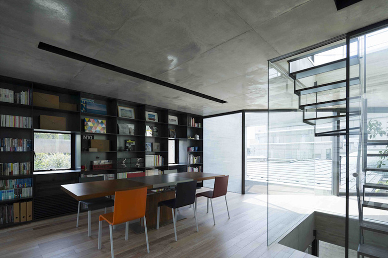 中央階段に面して設けた構造壁により緩やかに分節された空間には回遊性が生まれ、適度な距離を持ちながら親密な関係性をつくりあげている。界隈を一望できる屋上にはウッドデッキを敷き詰め、アウトドアリビングとしてバーベキューなども楽しむことが可能だ。