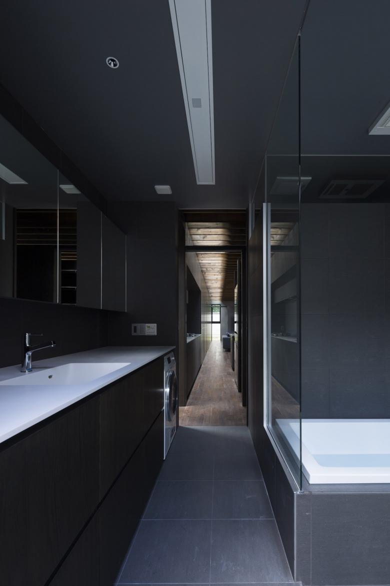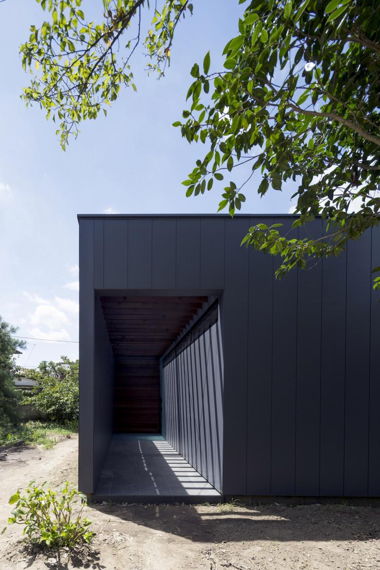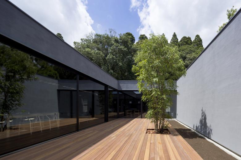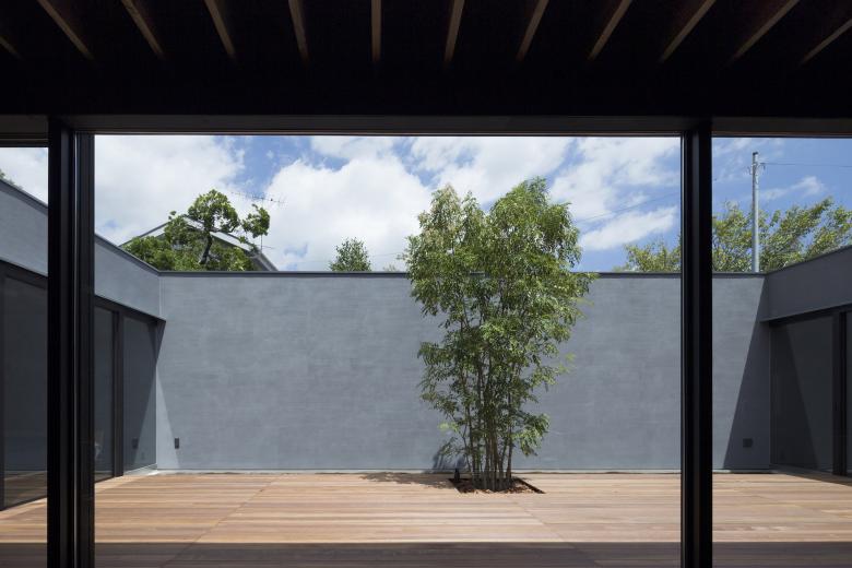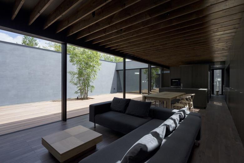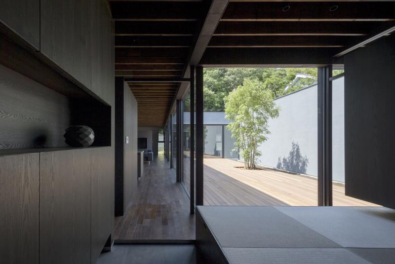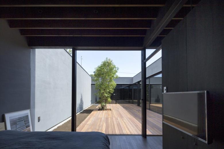シンプルな外観は黒いガルバリウム鋼鈑で覆われ、ノスタルジーを感じる路地奥のようなアプローチから玄関を入るとまず現れるのがコの字型平面中央にある大きな中庭だ。玄関横奥には母の寝室を、その手前には客間やセカンドリビングとしても利用ができるオープンな和室を設け、いずれも中庭の景色を堪能できる。玄関を挟んで反対側にはサニタリールームを設え、物干しを兼ねたバスコートから光が取り込めるバスルームも開放的だ。