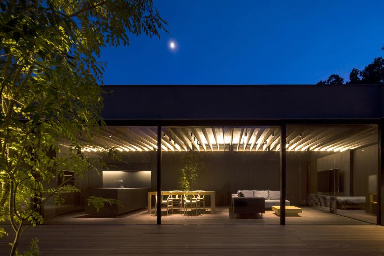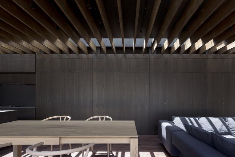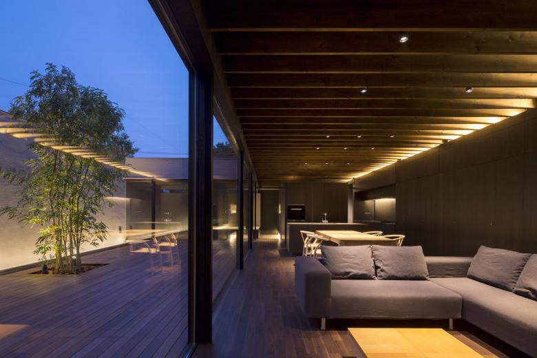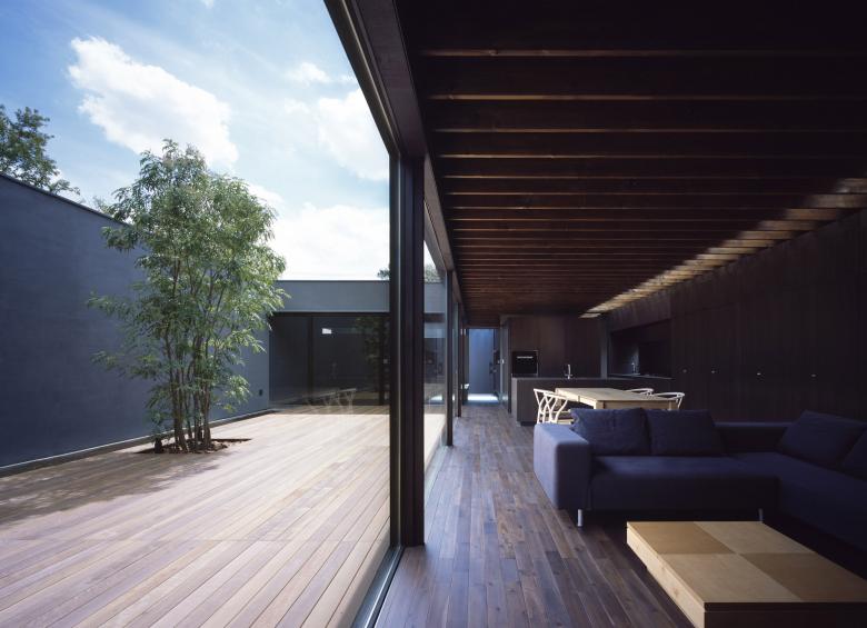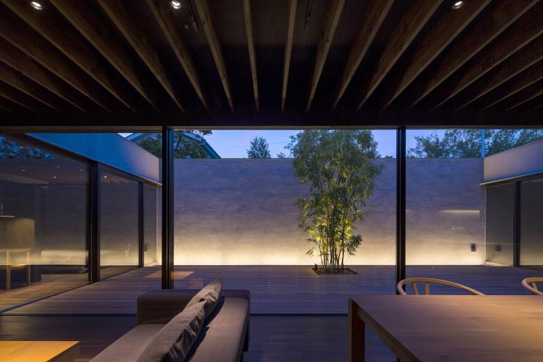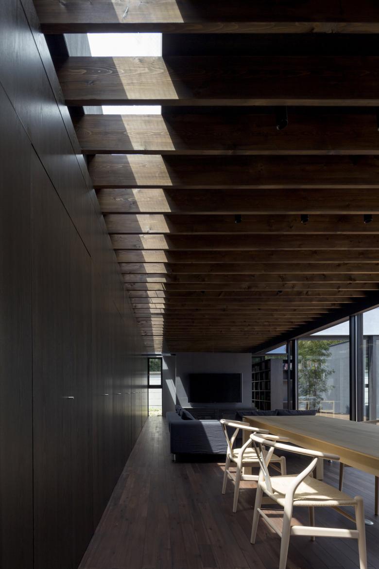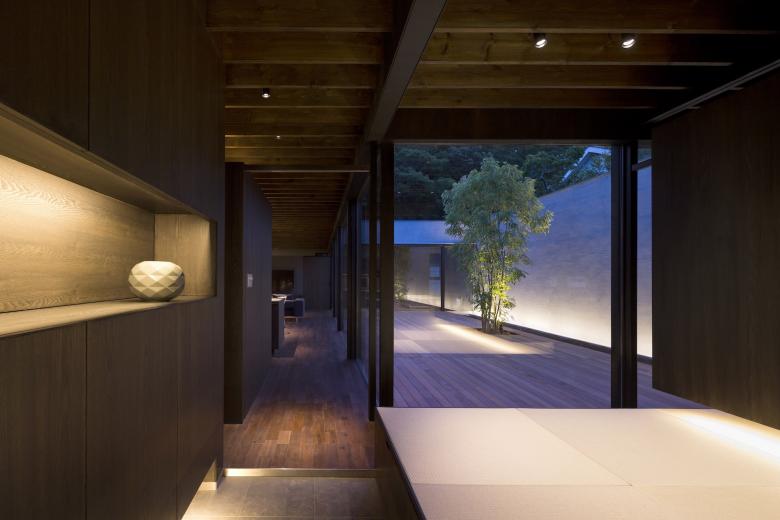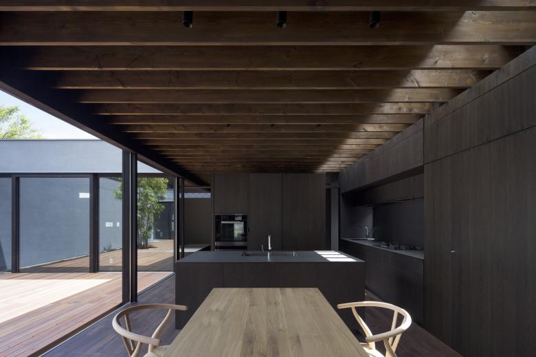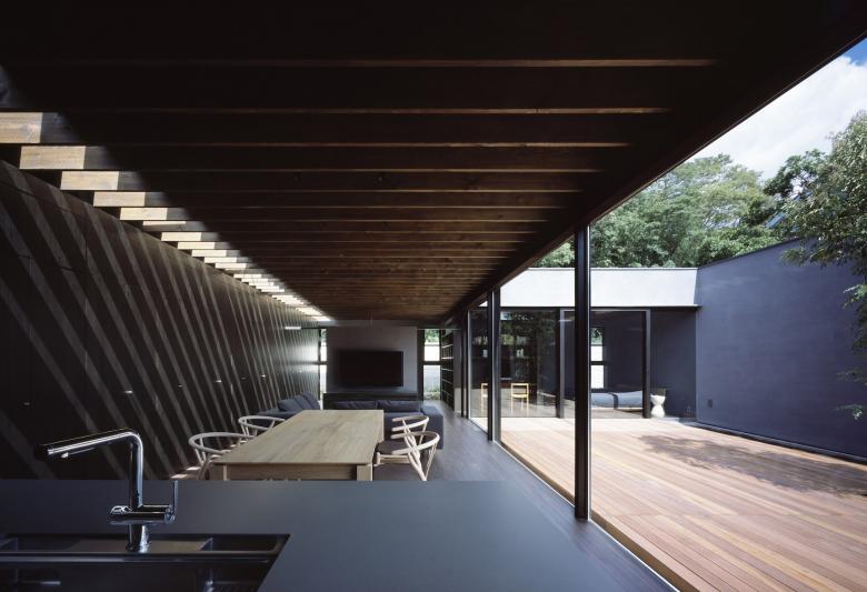 デッキ敷き大きなテラスとした中庭にはシンボルツリーが植えられ、LDKと正対している。普段から本格的な料理を行うご主人のために設えたフルオーダーキッチンは、オープンスタイルなプロ仕様とし、バックスペースには多くの食材ストックできるパントリーエリも準備されているため使いやすい。LDKには壁面収納を統一することでモノを見せない工夫をし、上部トップライトからの自然光が、ダークブラウンで統一した室内に力強いコントラストを生み出している。
