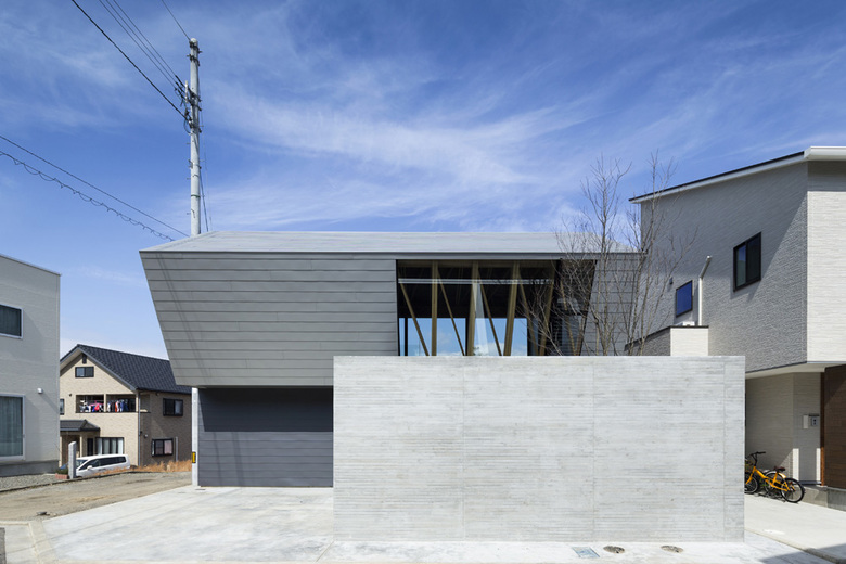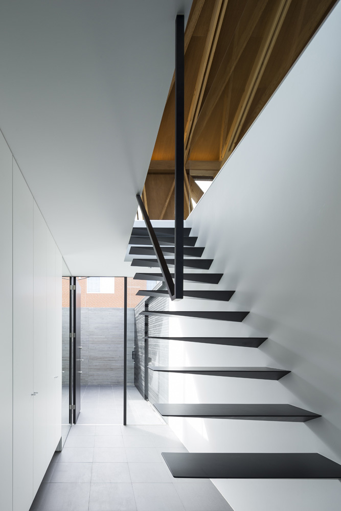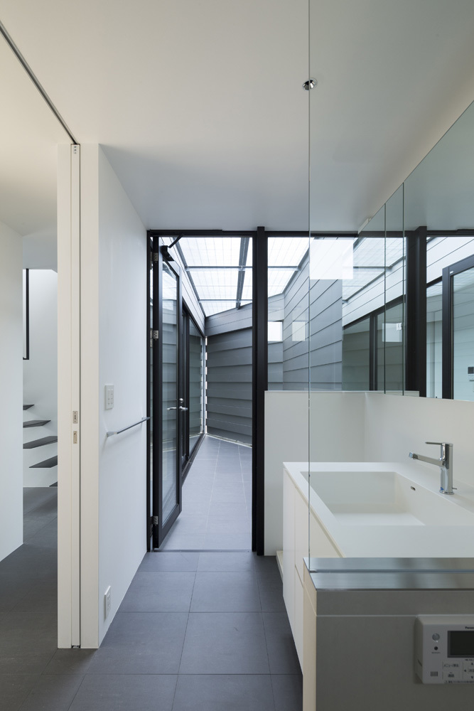 杉板コンクリート打放し塀とガルバリウム鋼板の外壁がクールな対比を生みだし、端正な外観を構成している。大きな開口部を介して木構造の一部が垣間見える部分を除き、外部から内部の様子を窺い知ることはできない。木製門扉の内側にはRC壁で囲われたエントランスコートが現われ、夜には間接照明が主を出迎える。玄関ドア正面にはオブジェのような鉄骨キャンティ階段を設えた。奥に広がるバスコートにはグレーチングを介して柔らかな拡散光が降り注ぐ。主に1階には浴室や個室を設え、全空間が中庭に面するよう計画した。子供室の中庭にあるシンボルツリーのヒメシャラはファサードのアクセントにもなっている。