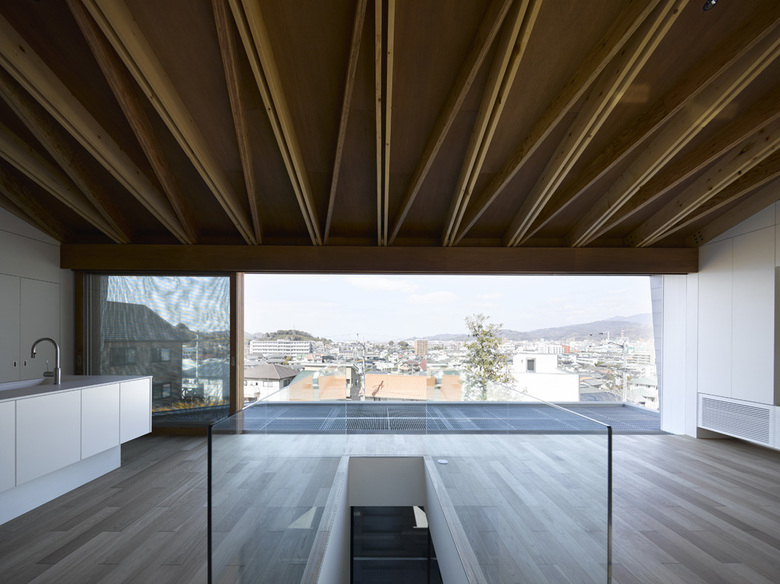 眺望を獲得できる高台に土地を購入した建主は広告代理店に勤めるグラフィックデザイナーで、開放性の高い建築空間を希望した。